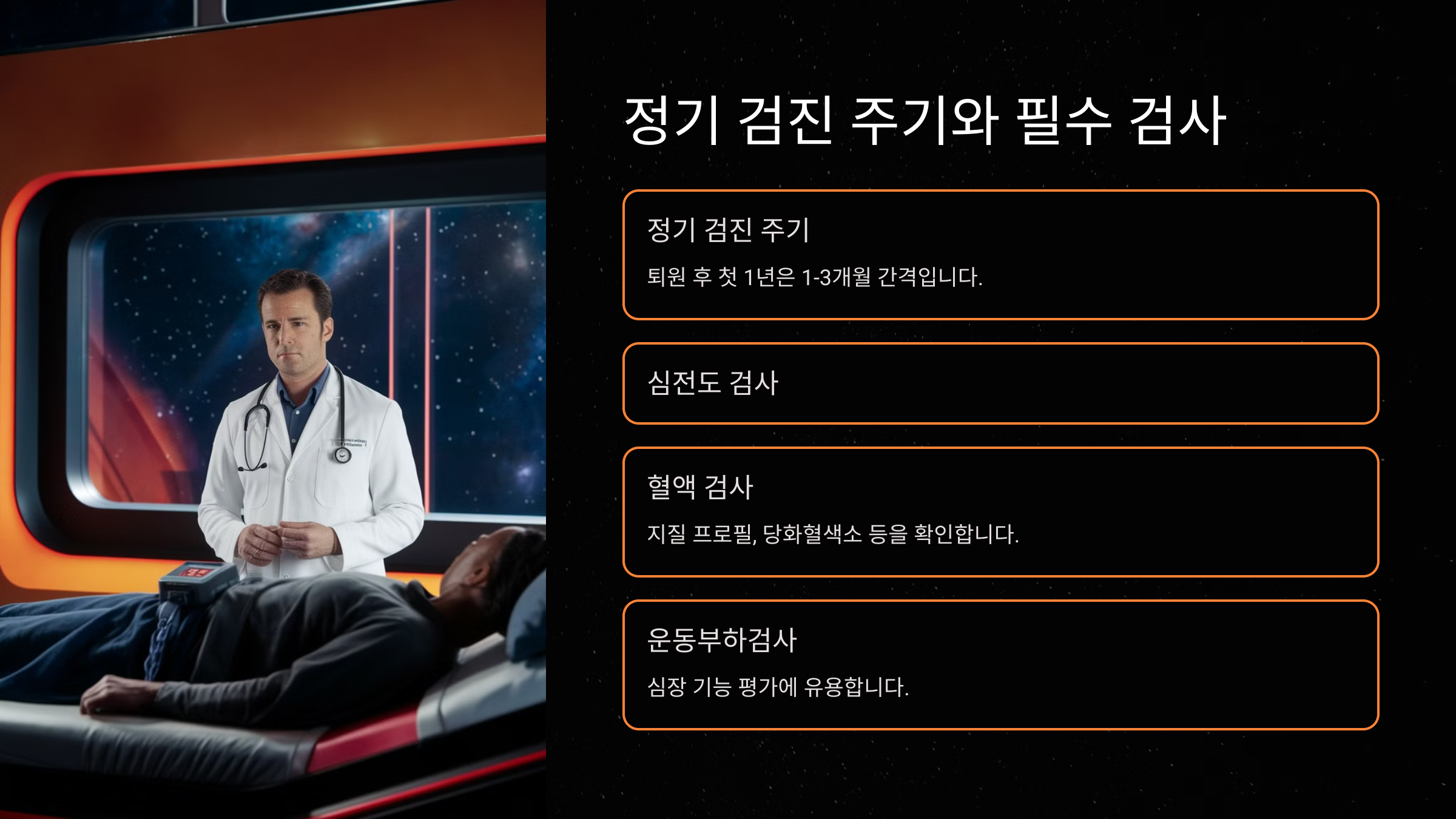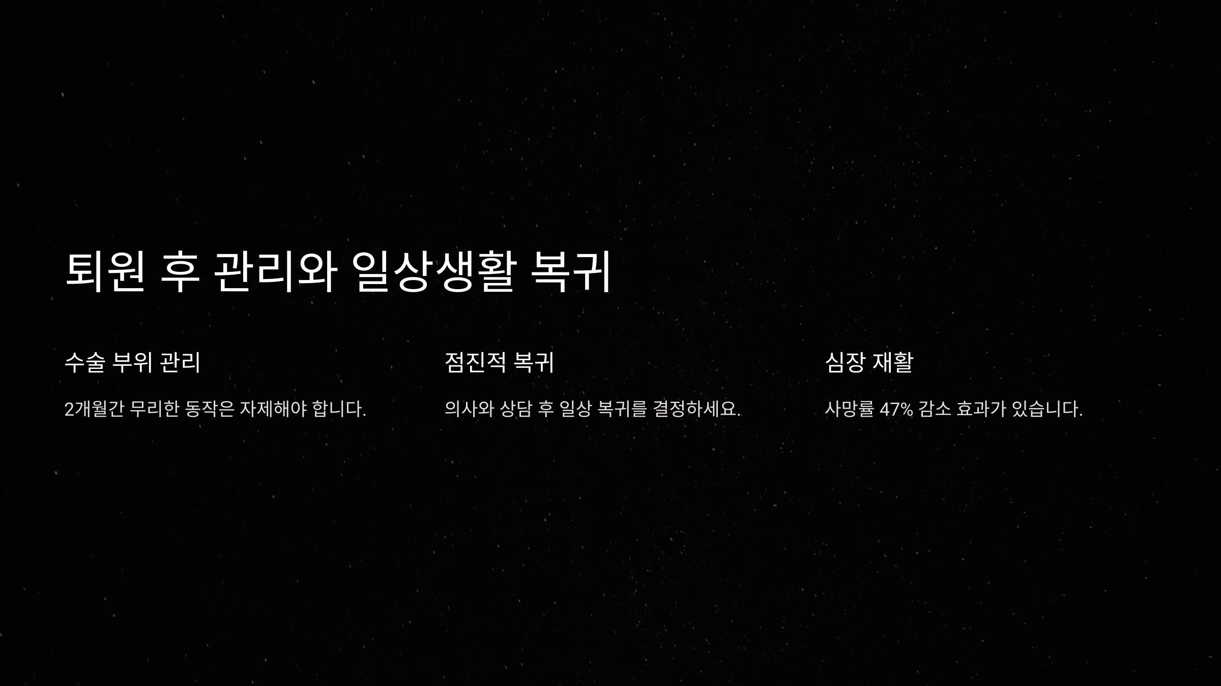 | 퇴원 후 1~2개월 | 무리한 운동 금지, 약물 복용 철저히 |