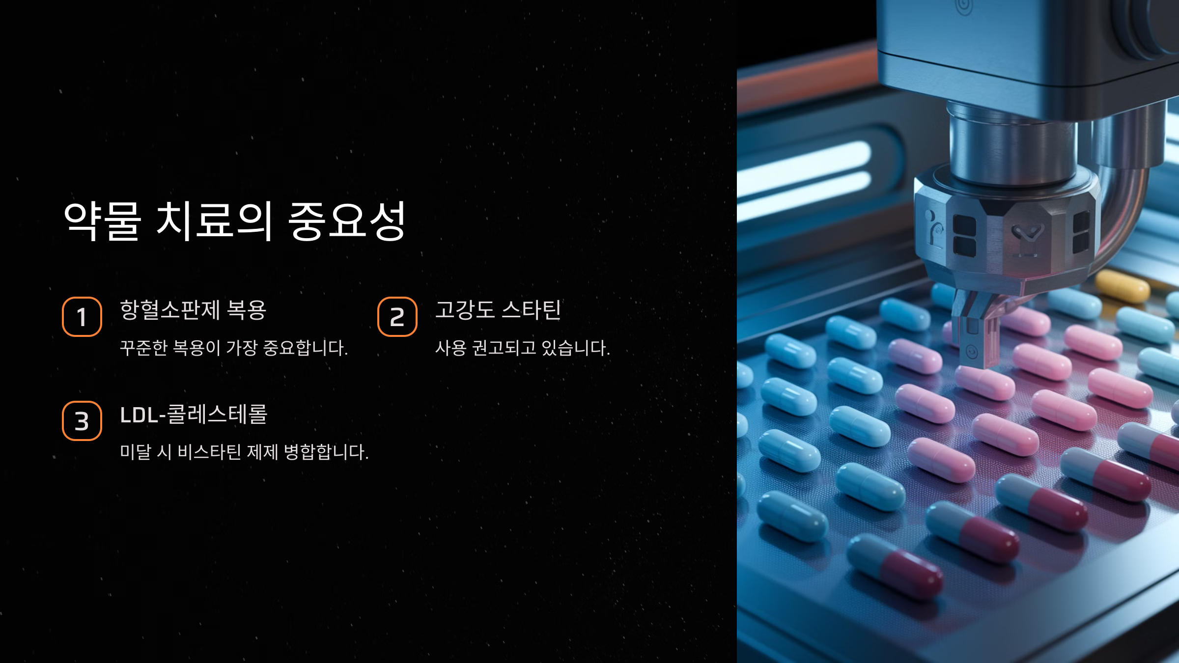 약물 치료는 단순히 증상을 완화하는 것이 아니라, **심근경색 재발을 막고 심장을 보호하는 중요한 역할**을 해요. 따라서 약을 끊으면 안 되고, 부작용이 있더라도 의사와 상담 후 대체 약을 찾는 것이 중요해요.