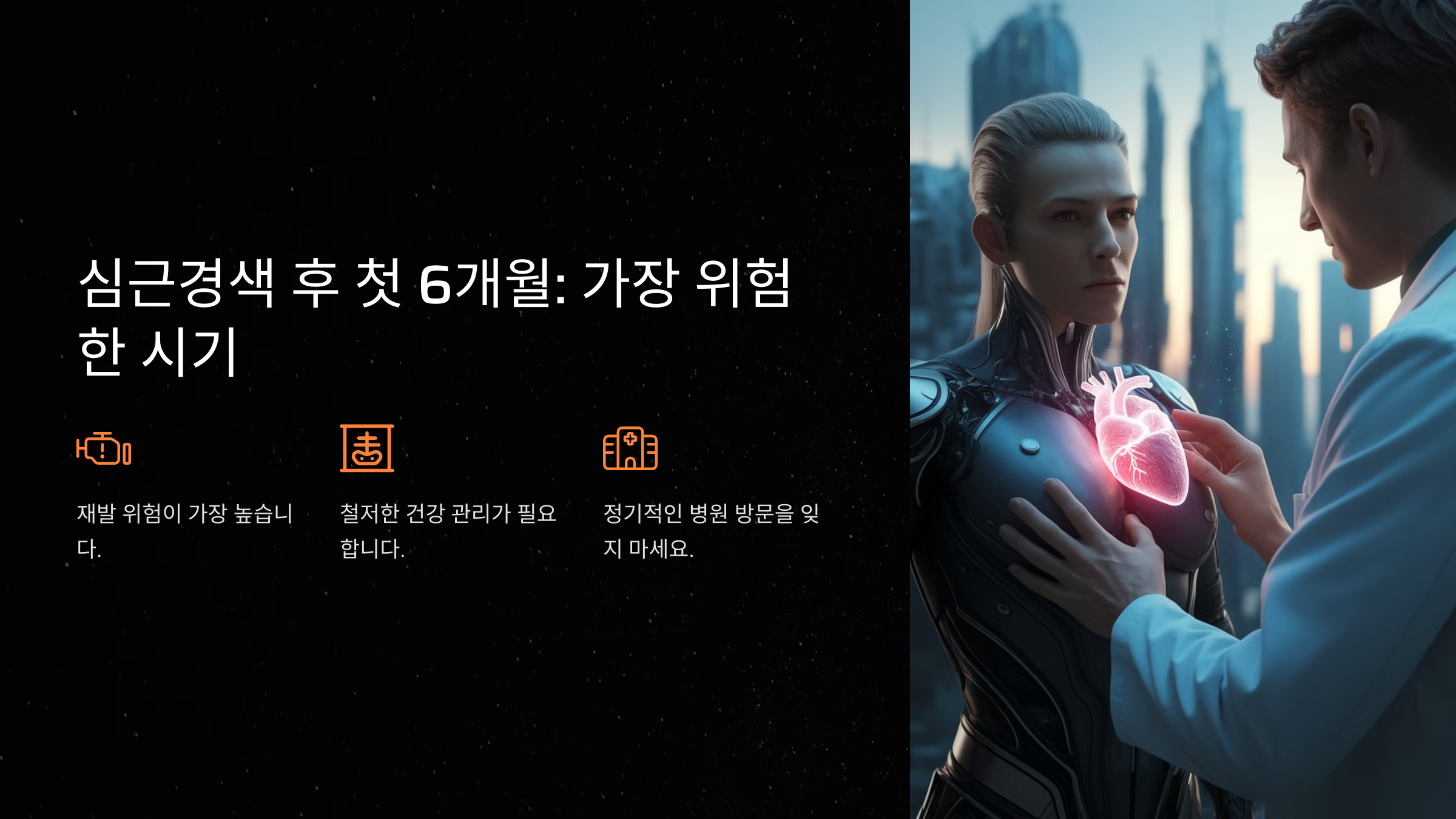 첫 6개월을 어떻게 보내느냐에 따라 앞으로의 심장 건강이 달라질 수 있어요. 이 시기를 안정적으로 보내야 심근경색 재발을 막고 건강한 삶을 유지할 수 있어요!