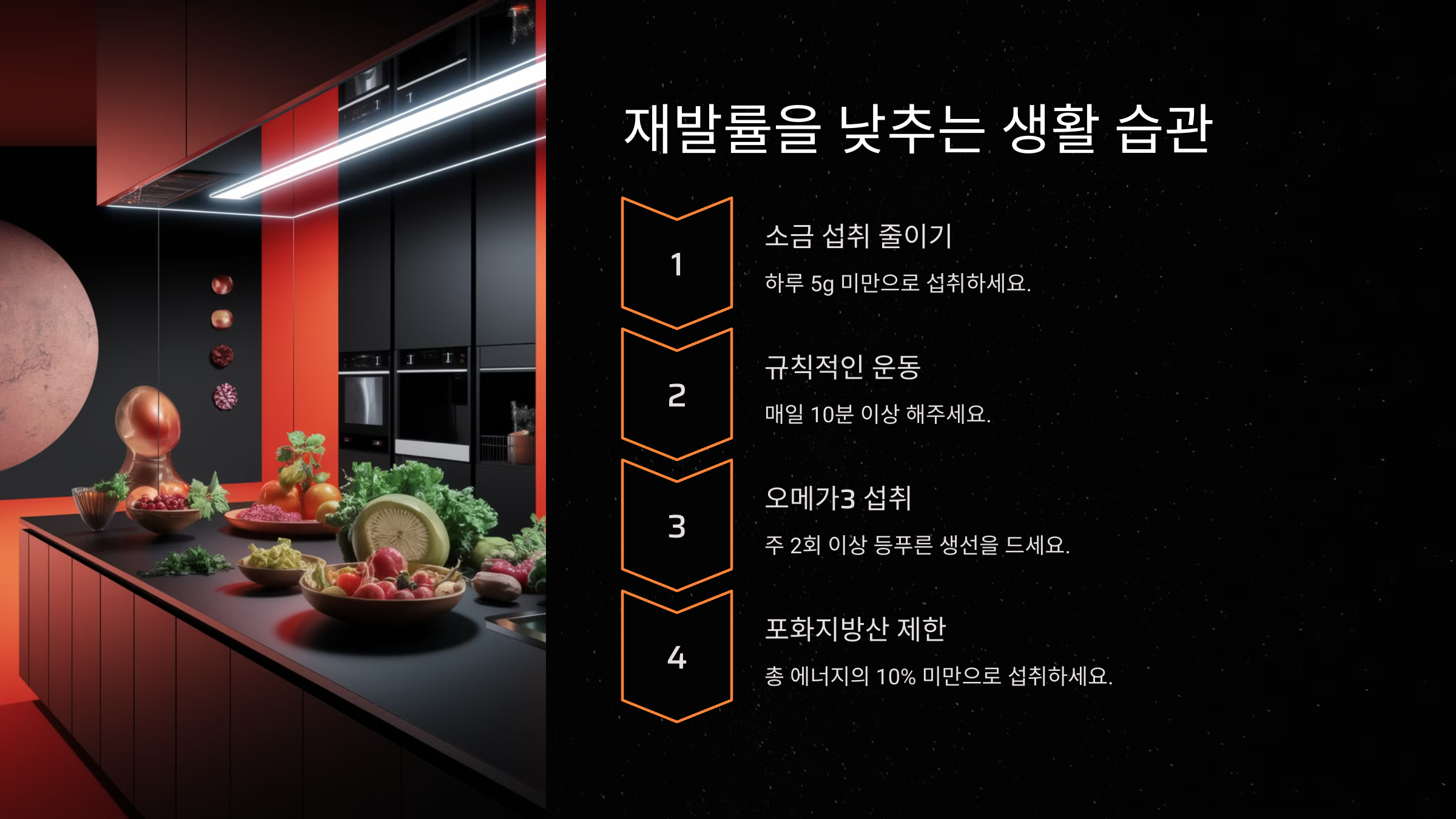 A7. **금연, 건강한 식습관, 꾸준한 운동, 약물 복용 준수, 정기 검진**이 가장 중요해요. 이 다섯 가지를 잘 지키면 재발 위험을 크게 줄일 수 있어요!