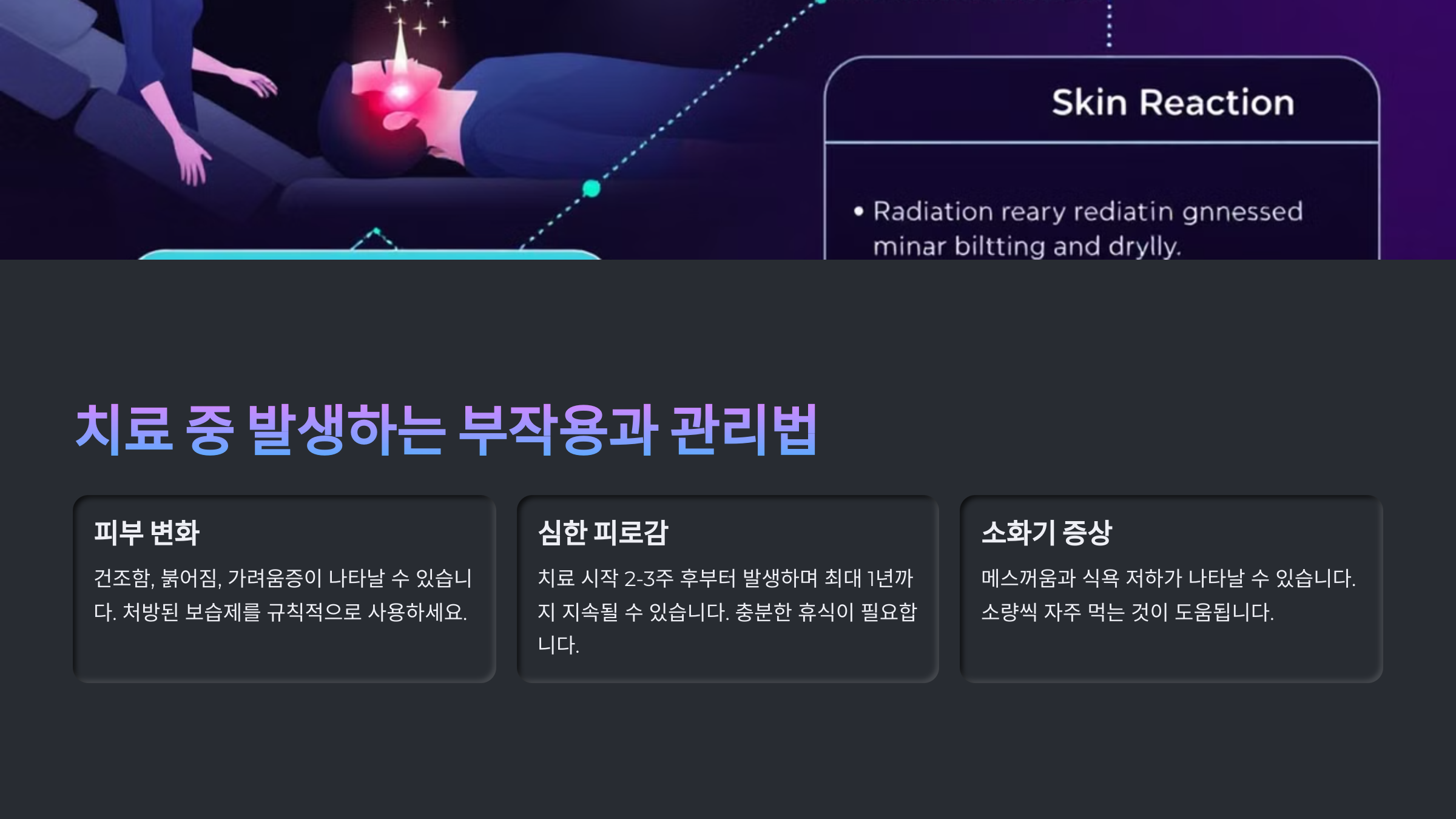 이제 방사선 치료 중 발생할 수 있는 부작용과 관리법에 대해 알아볼까요? 👇
