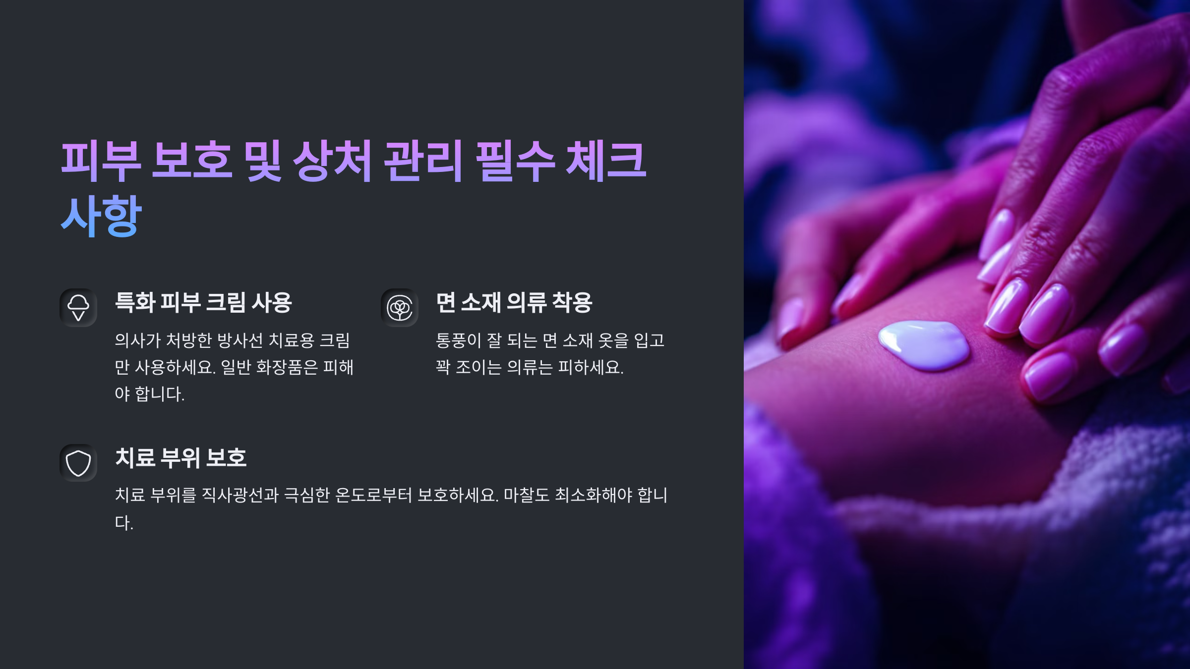 이런 부작용을 예방하려면 피부를 보호하는 것이 매우 중요해요! 특히 치료 부위를 문지르거나 강한 자극을 주지 않도록 주의해야 해요.