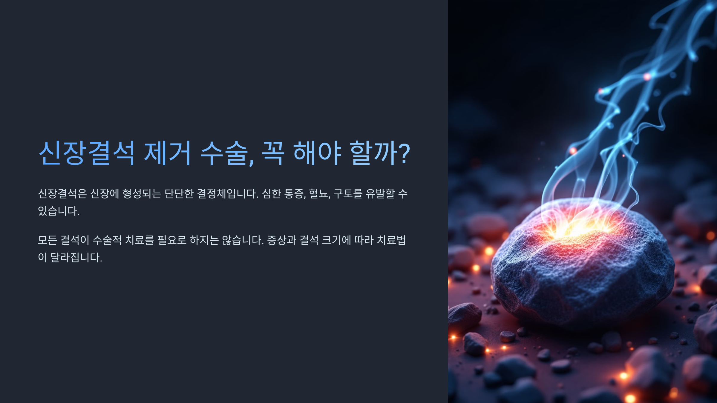 특히, 수술이 꼭 필요한 경우와 그렇지 않은 경우를 구분하는 것이 중요해요. 오늘은 신장결석 제거 수술이 필요한 경우와 각 수술 방법, 회복 과정, 비용 등에 대해 자세히 알아볼게요. 🏥