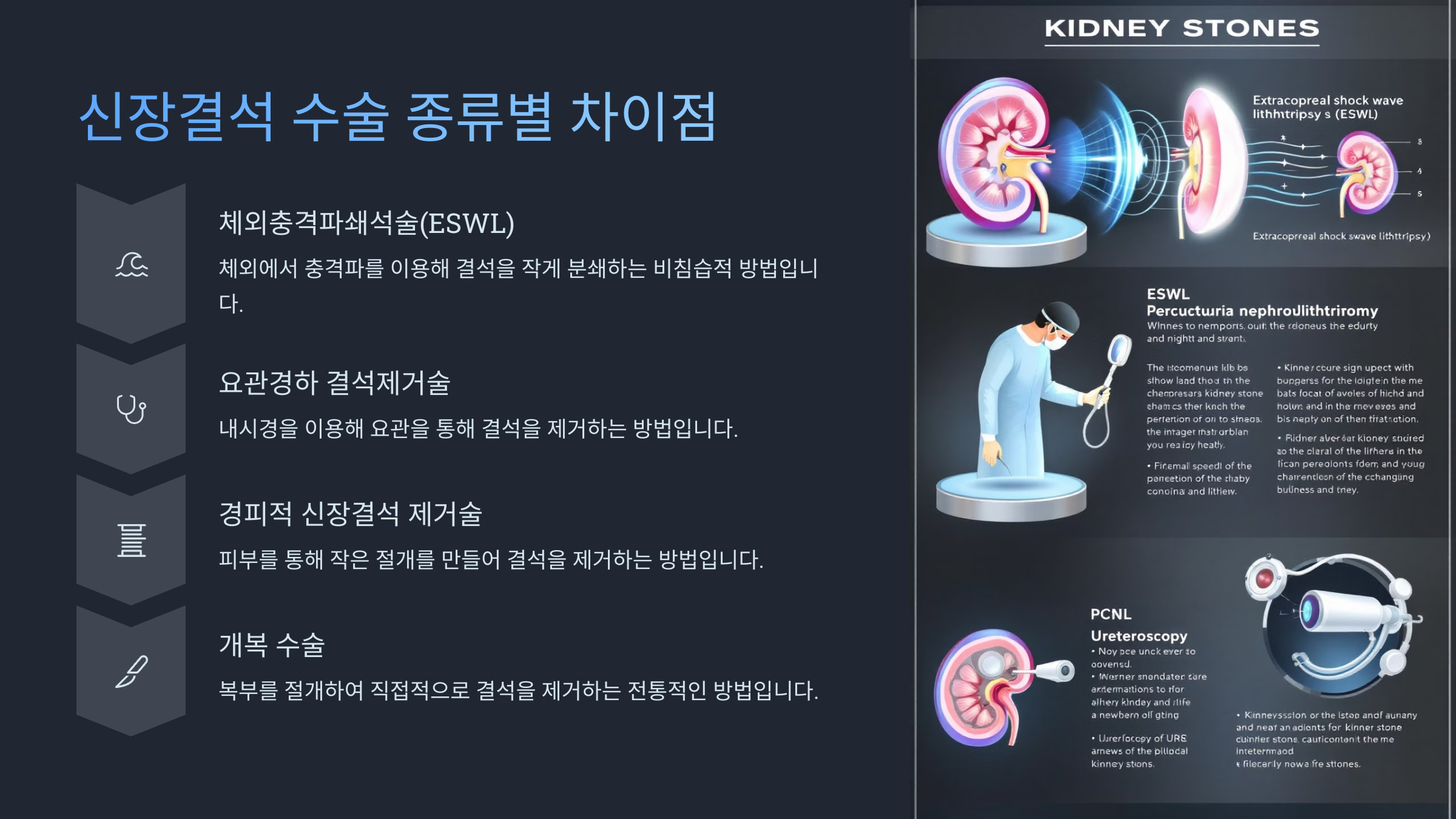 각 수술 방법마다 장점과 단점이 있으므로, 결석의 크기와 위치에 따라 적절한 방법을 선택해야 해요. 🔍