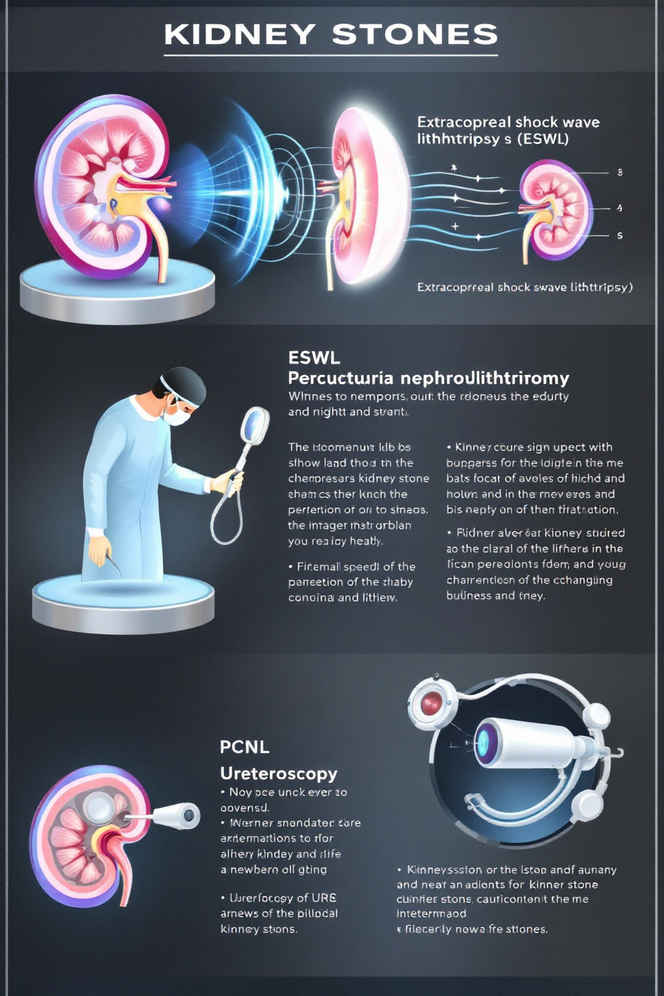 신장결석을 제거하는 수술은 여러 가지가 있어요. 가장 많이 시행되는 방법으로는 체외충격파쇄석술(ESWL), 요관경하 결석 제거술(URS), 경피적 신절석술(PCNL) 등이 있답니다.