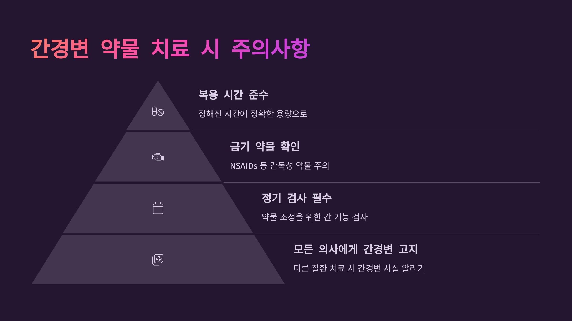 그럼, 간경변 치료 시 주의해야 할 주요 약물과 부작용을 정리해볼게요. 💊