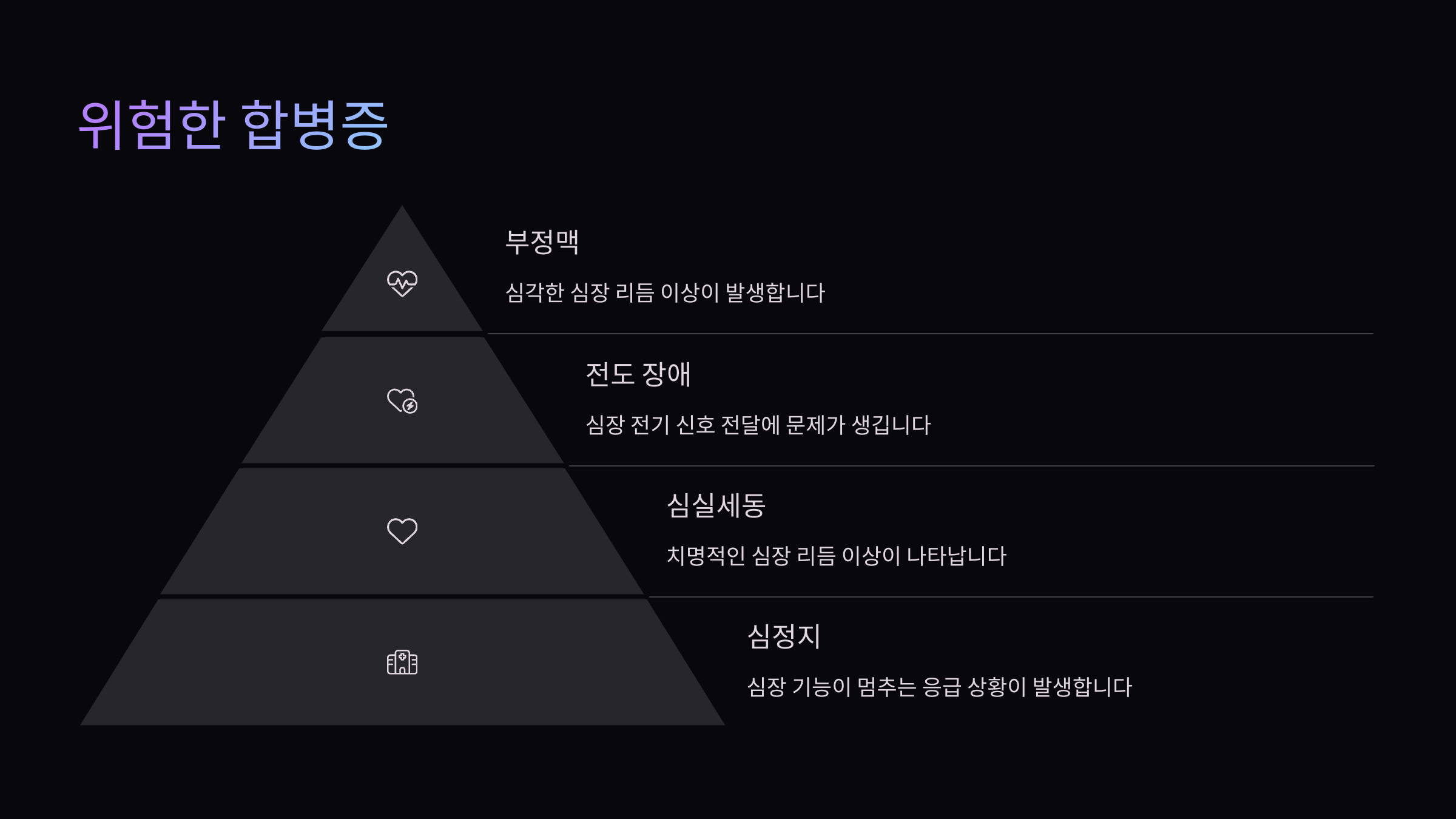 | 부정맥 | 심장 박동이 불규칙해지고, 심하면 심정지 발생 |