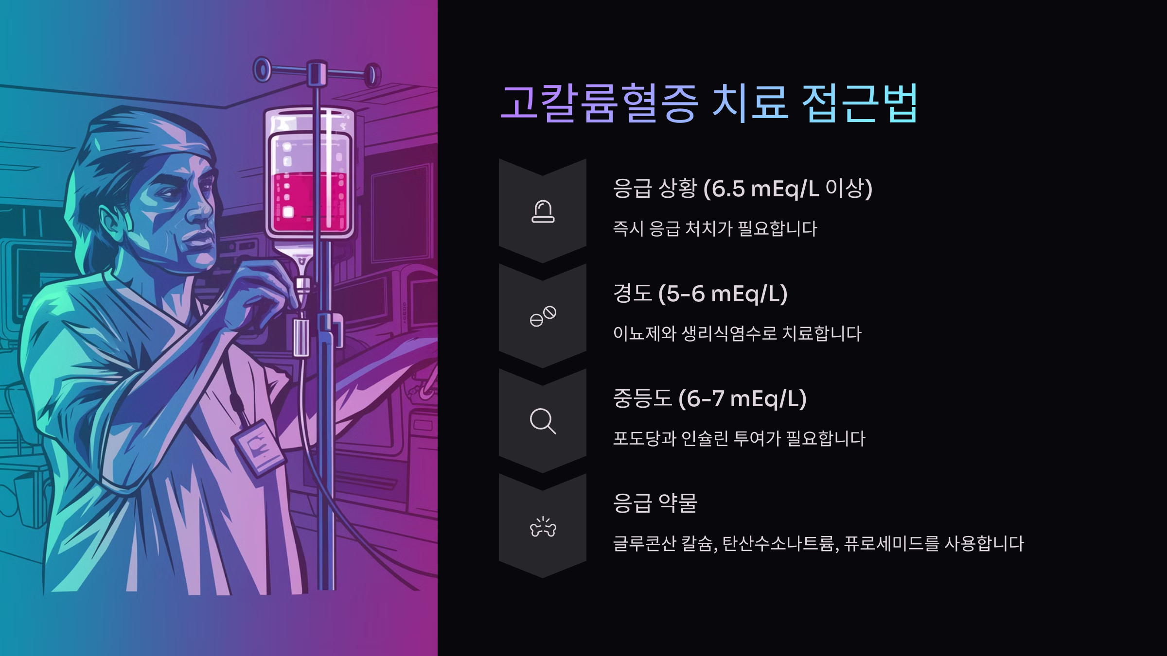 심한 경우 인슐린+포도당 주사, 중탄산나트륨 투여, 칼슘 주사 등이 사용돼요. 특히 부정맥이 동반된 경우 칼슘 글루코네이트를 사용해 심장 보호를 먼저 해야 해요. 🔬