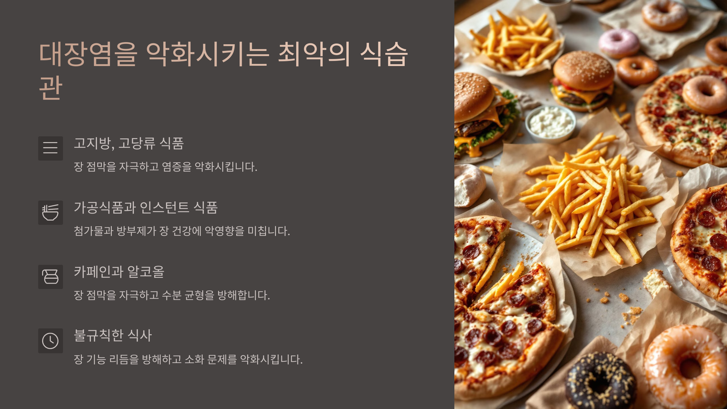 대장염 환자라면 반드시 피해야 할 음식들이 있어요. 잘못된 식습관이 장을 자극해 염증을 악화시키기 때문이죠. 특히 다음과 같은 음식들은 장 건강을 위협하는 주범이에요.