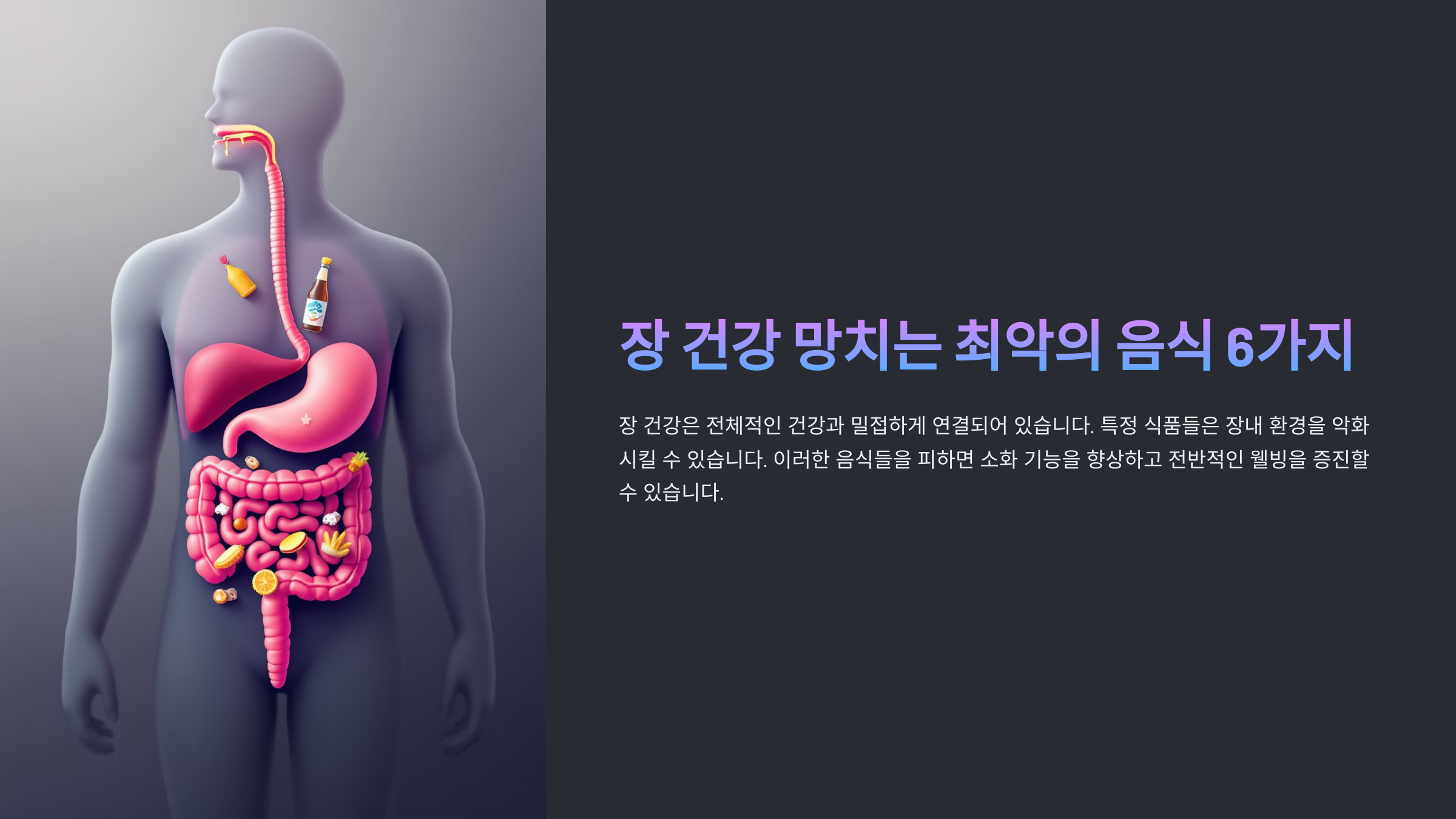 장 건강을 지키기 위해서는 자연식품 위주의 식단을 유지하고, 당분과 인공 첨가물을 줄이는 것이 중요해요! 다음으로, 소화 장애를 유발하는 가공식품에 대해 알아볼게요. 🍽️
