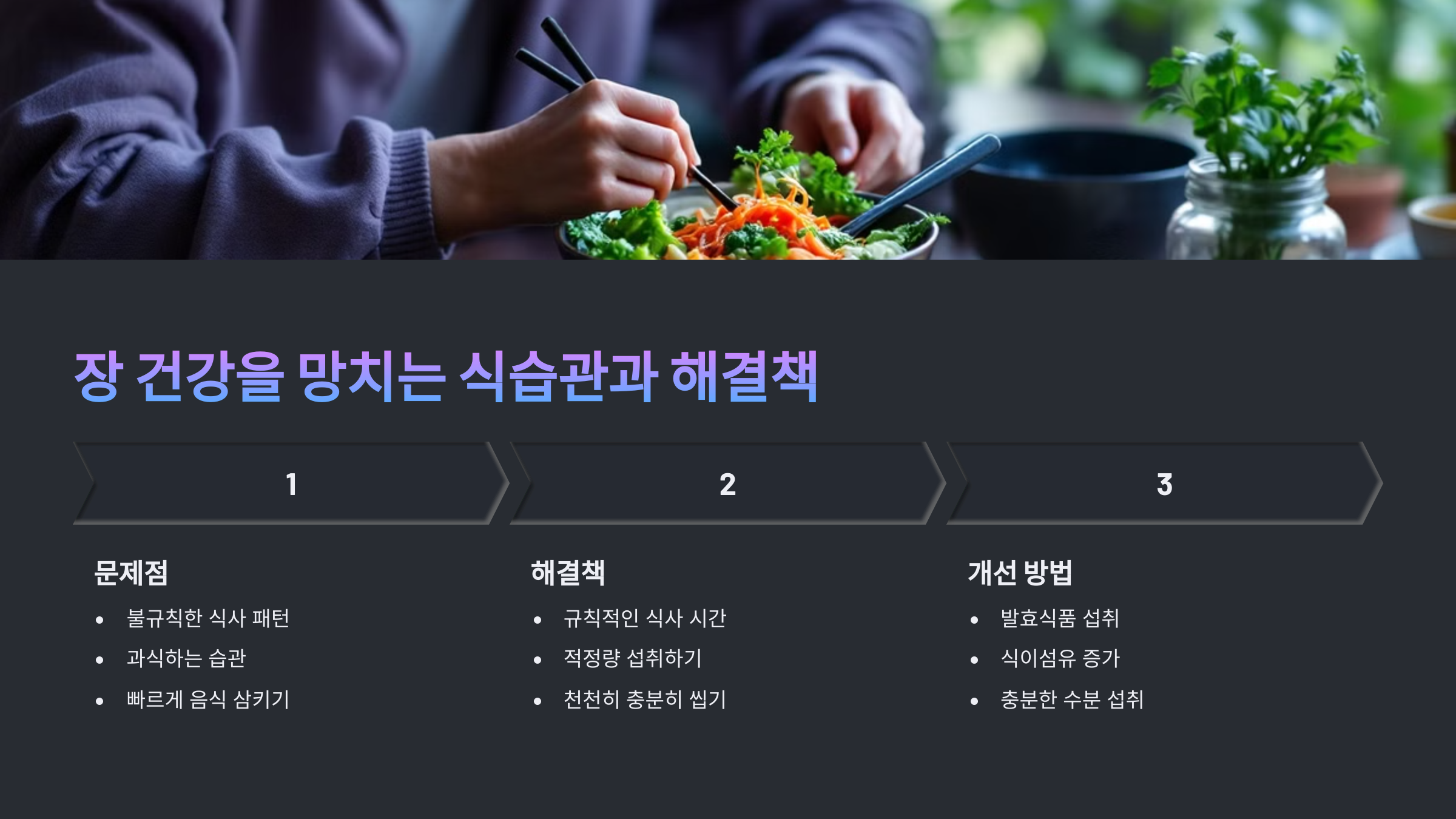 음식뿐만 아니라 식습관도 장 건강에 큰 영향을 미쳐요. 아무리 좋은 음식을 먹어도 나쁜 습관을 유지하면 장내 환경이 악화될 수 있어요. 😵💫