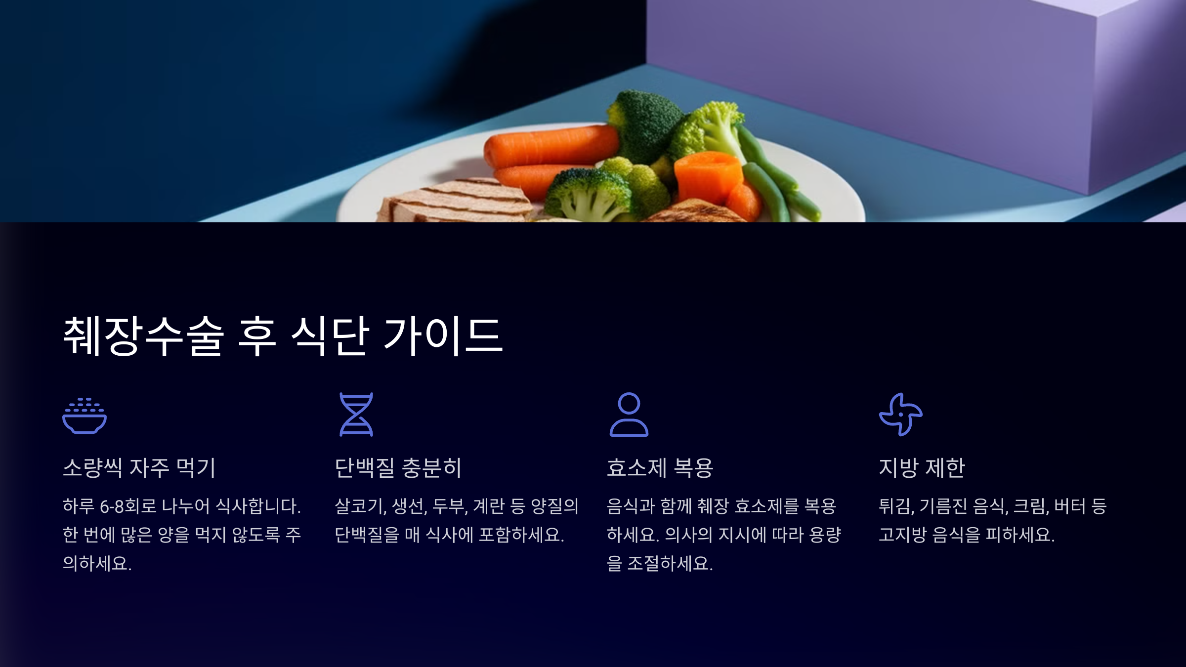 다음으로, 췌장수술 후 반드시 따라야 할 **식단 가이드**를 알아볼까요? 🍽️