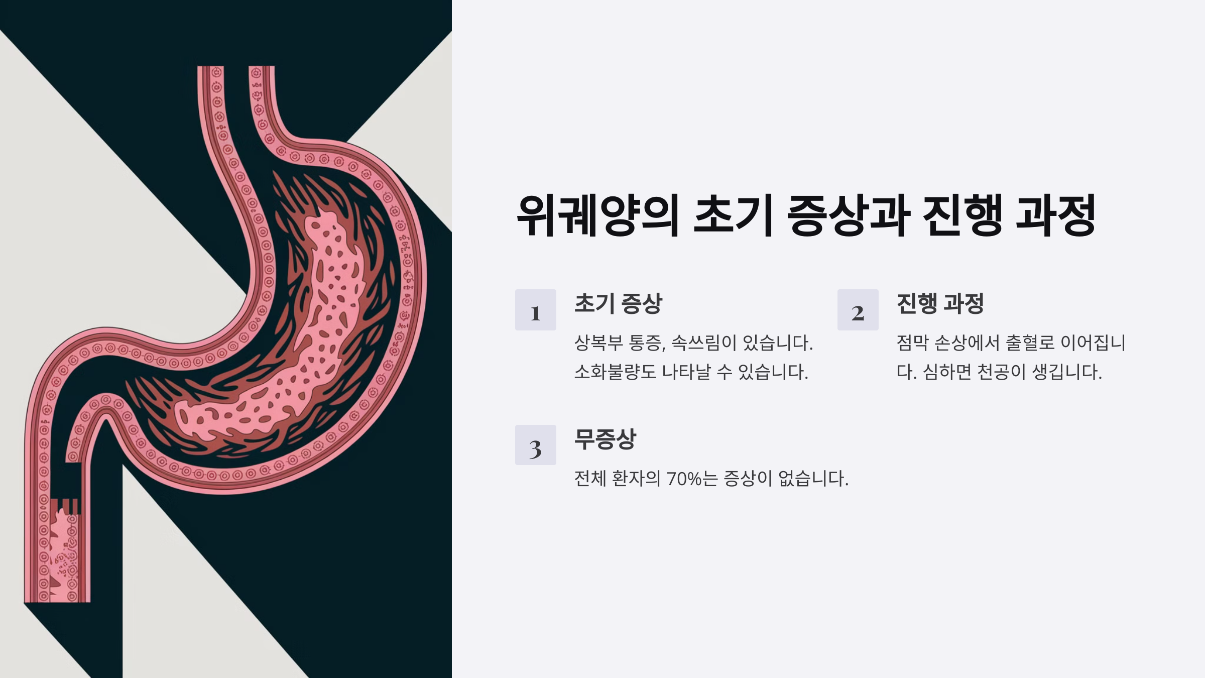 위궤양은 위 점막이 손상되면서 궤양이 생기는 질환이에요. 많은 사람이 소화불량 정도로 가볍게 여기다가 병을 키우는 경우가 많죠. 하지만 치료를 늦추면 출혈, 천공, 심각한 합병증까지 유발할 수 있어요. 🚨