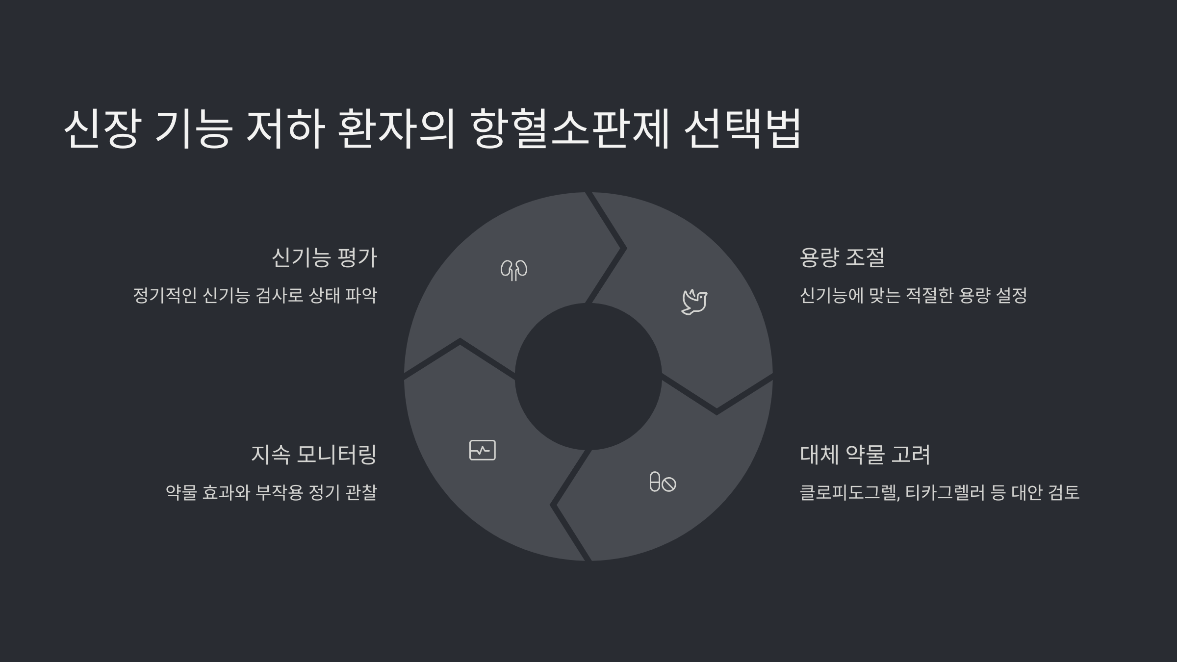 신장 기능이 저하된 환자는 항상 의사와 상담 후 적절한 항혈소판제를 선택해야 해요. 신장 기능 검사(크레아티닌, eGFR)를 정기적으로 확인하는 것도 중요해요! 🏥