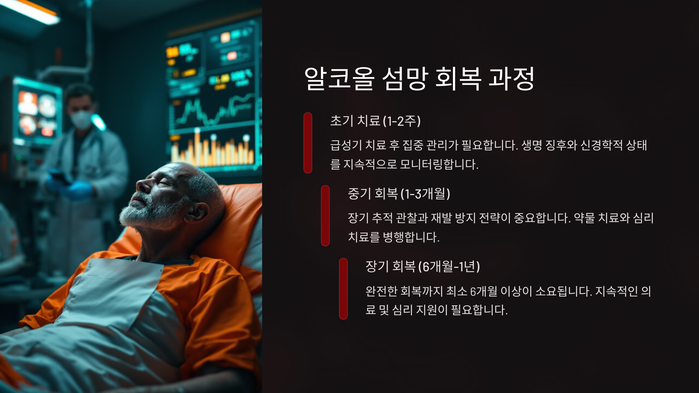 ⏳ 알코올 섬망의 회복 기간은 환자의 상태와 치료 시작 시점에 따라 다르지만, 일반적으로 급성 증상은 3일에서 7일 사이에 호전되는 경우가 많아요. 하지만 그 이후에도 지속적인 관리가 필수예요.