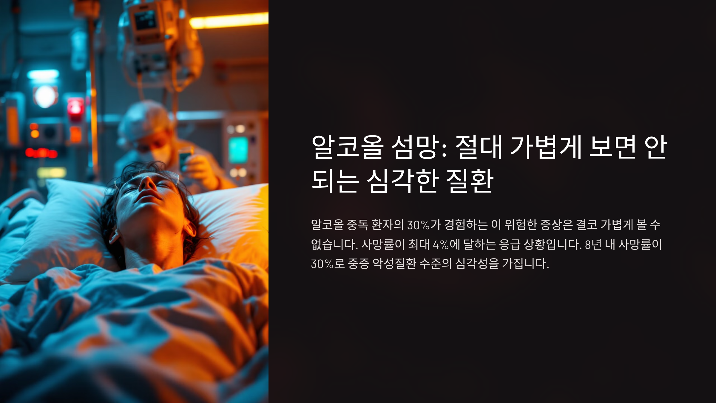 🚨 알코올 섬망은 긴급한 응급상황이에요. 환자가 환각을 보거나 이상 행동을 하기 시작했다면 즉시 병원으로 이동해야 해요. 이 상태는 혼자 두면 더 위험하고, 자해 또는 타해로 이어질 수도 있어요.