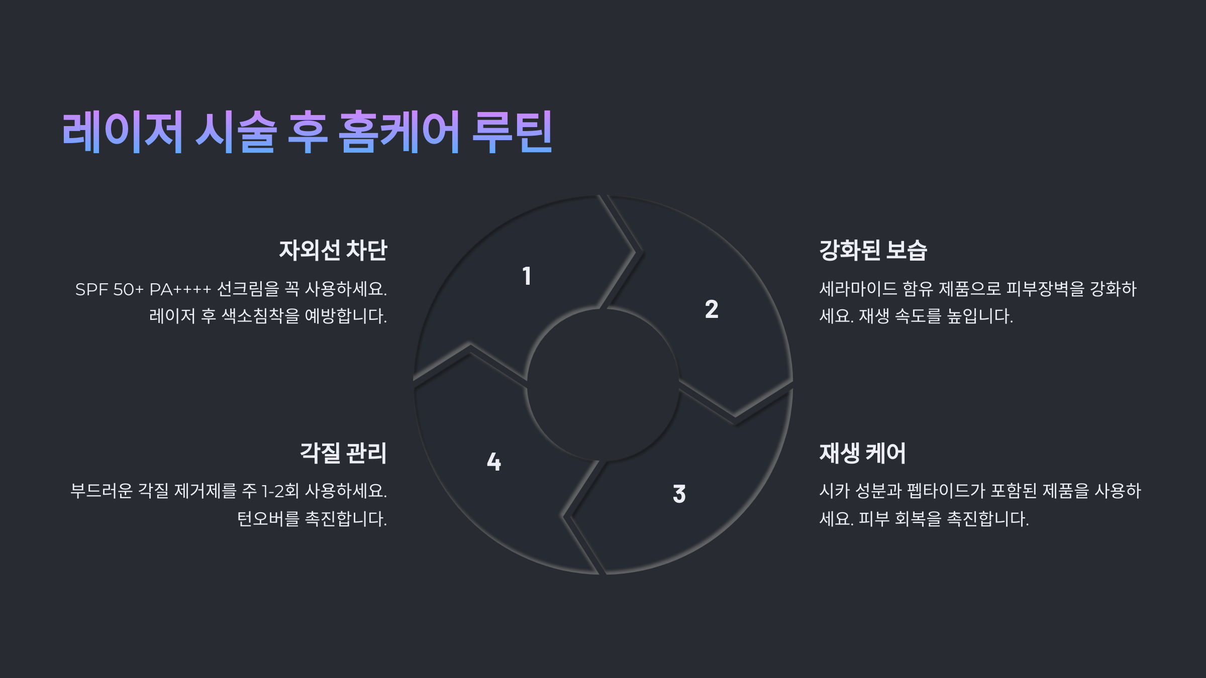 레이저 시술 후에는 피부가 예민해질 수 있기 때문에 충분한 휴식과 보습이 중요해요. 또한, 자극적인 스크럽 제품은 피하고, 피부를 보호하는 습관을 유지하는 것이 좋아요! 😊
