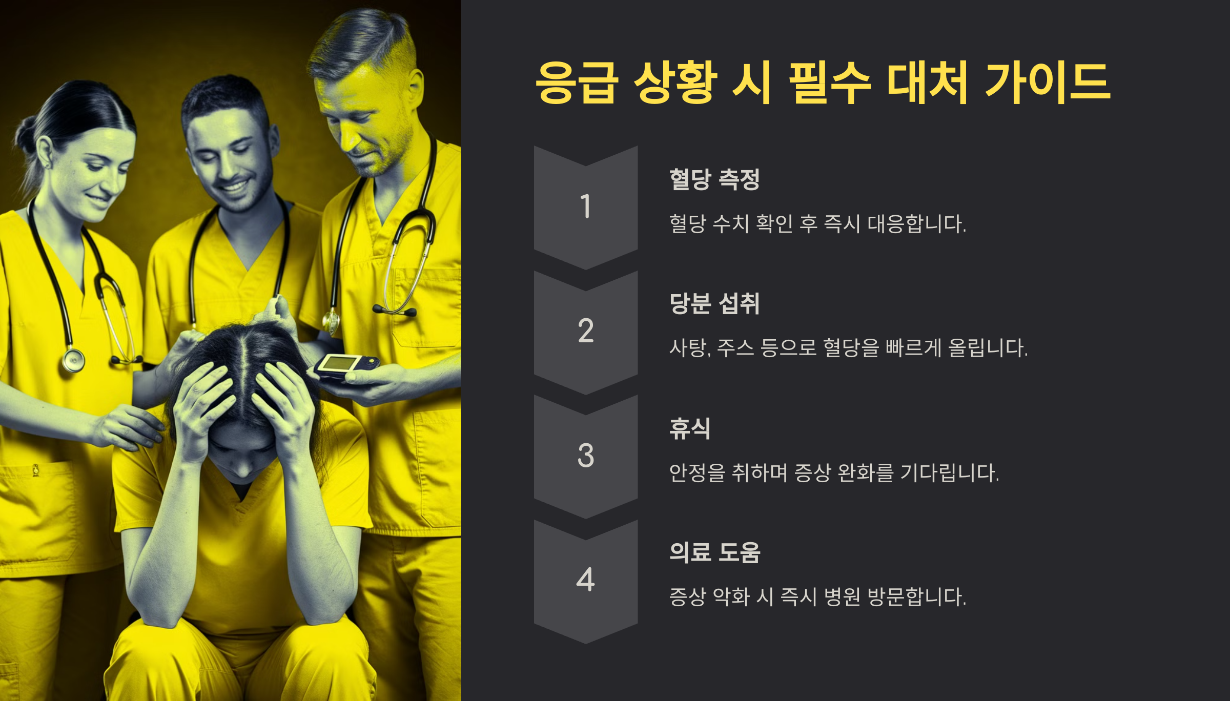저혈당 증상이 나타나면 즉시 혈당을 올릴 수 있는 조치를 취해야 해요. 그렇지 않으면 혼수 상태로 이어질 수 있기 때문이에요. 혈당이 50mg/dL 이하로 떨어지기 전에 빠르게 대처하는 것이 중요하답니다!
