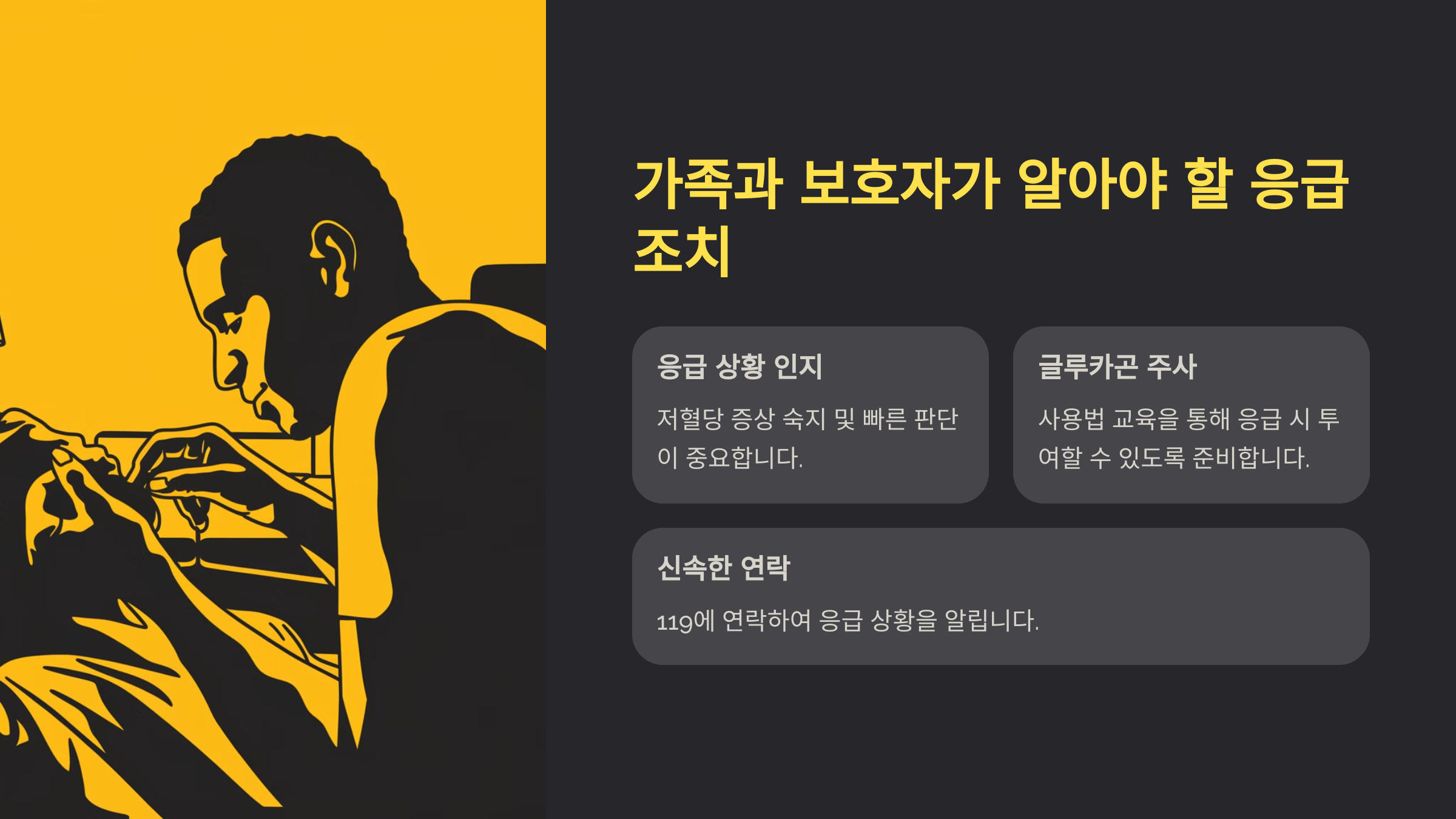 인슐린 쇼크가 발생했을 때 빠른 대처가 생명을 살릴 수 있어요. 평소에 응급 대응법을 익혀 두고, 가족과 주변 사람들에게도 알려주세요!