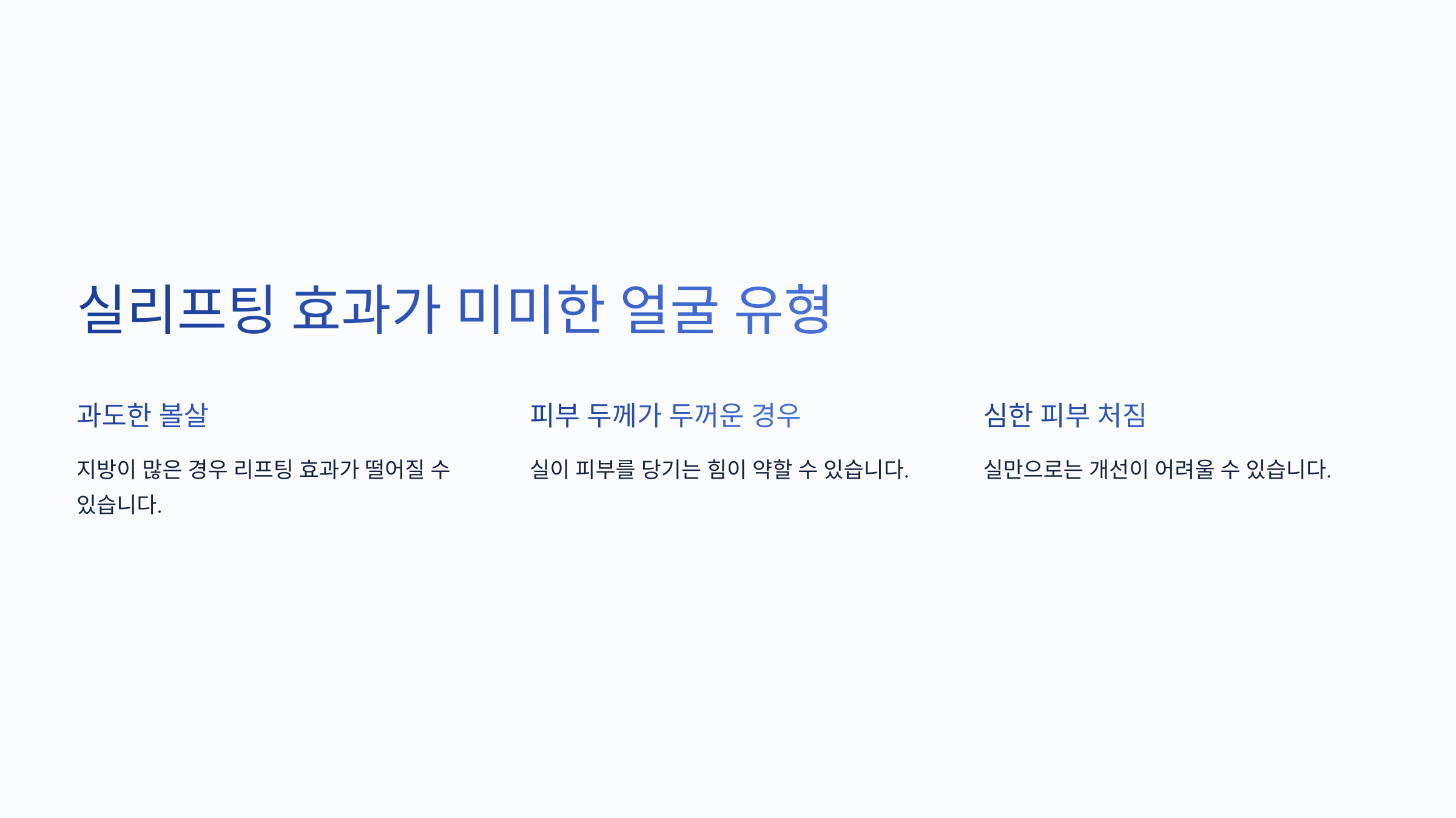 실리프팅은 피부를 당겨주는 원리지만, 모든 얼굴형에 효과적인 것은 아니에요. 특히 아래와 같은 경우 실리프팅의 효과가 미미하거나, 오히려 부작용이 생길 수 있어요.