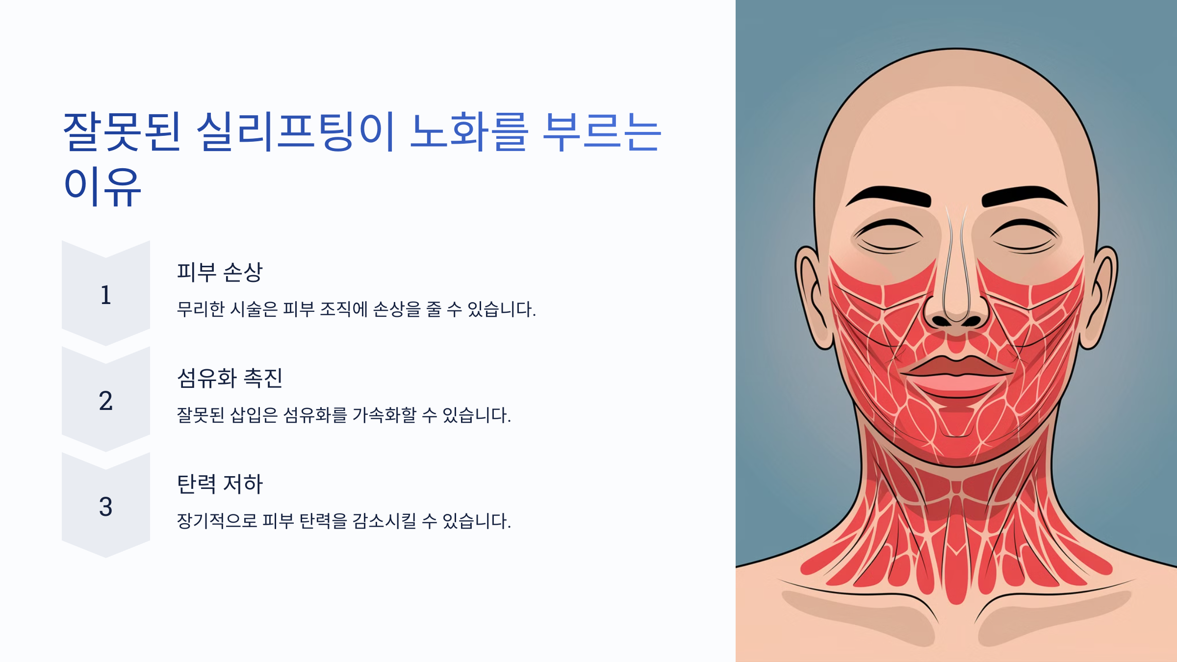실리프팅이 잘못 시행되면 피부 조직에 손상을 주고, 오히려 노화를 촉진할 수도 있어요. 피부 속에서 실이 자극을 주면서 염증이 생기거나, 반복적인 시술로 인해 피부가 점점 더 얇아질 수 있어요.