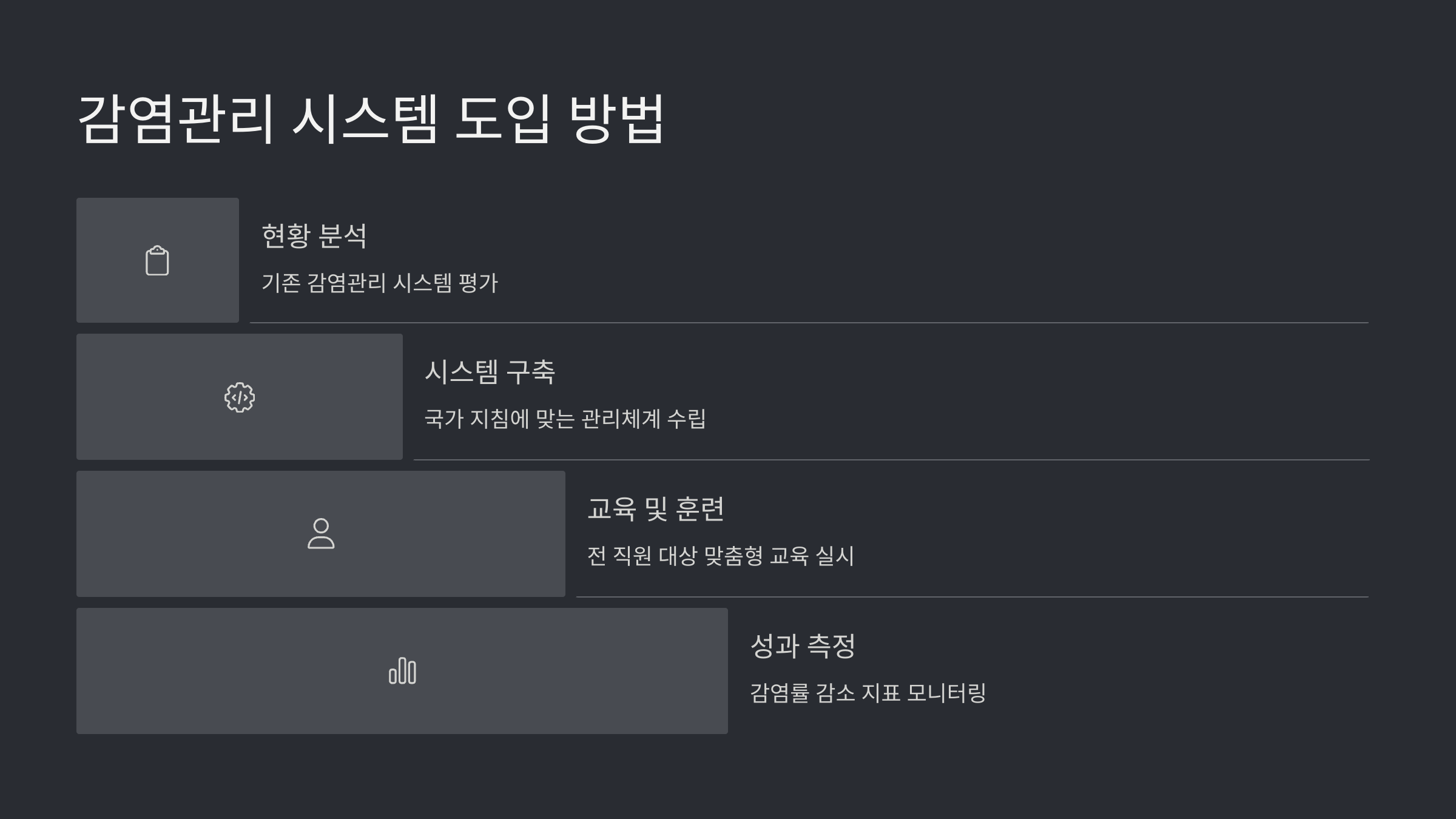 세 번째는 행동지표를 수립하고 주기적으로 평가하는 거예요. 손 위생 이행률, 격리 병상 사용률, 감염률 등의 지표를 주기적으로 확인하고, 개선계획을 세워야 해요. 단순한 수치 기록이 아니라, 감염에 영향을 주는 원인을 찾아내고 시스템적으로 대응하는 것이 핵심이에요.