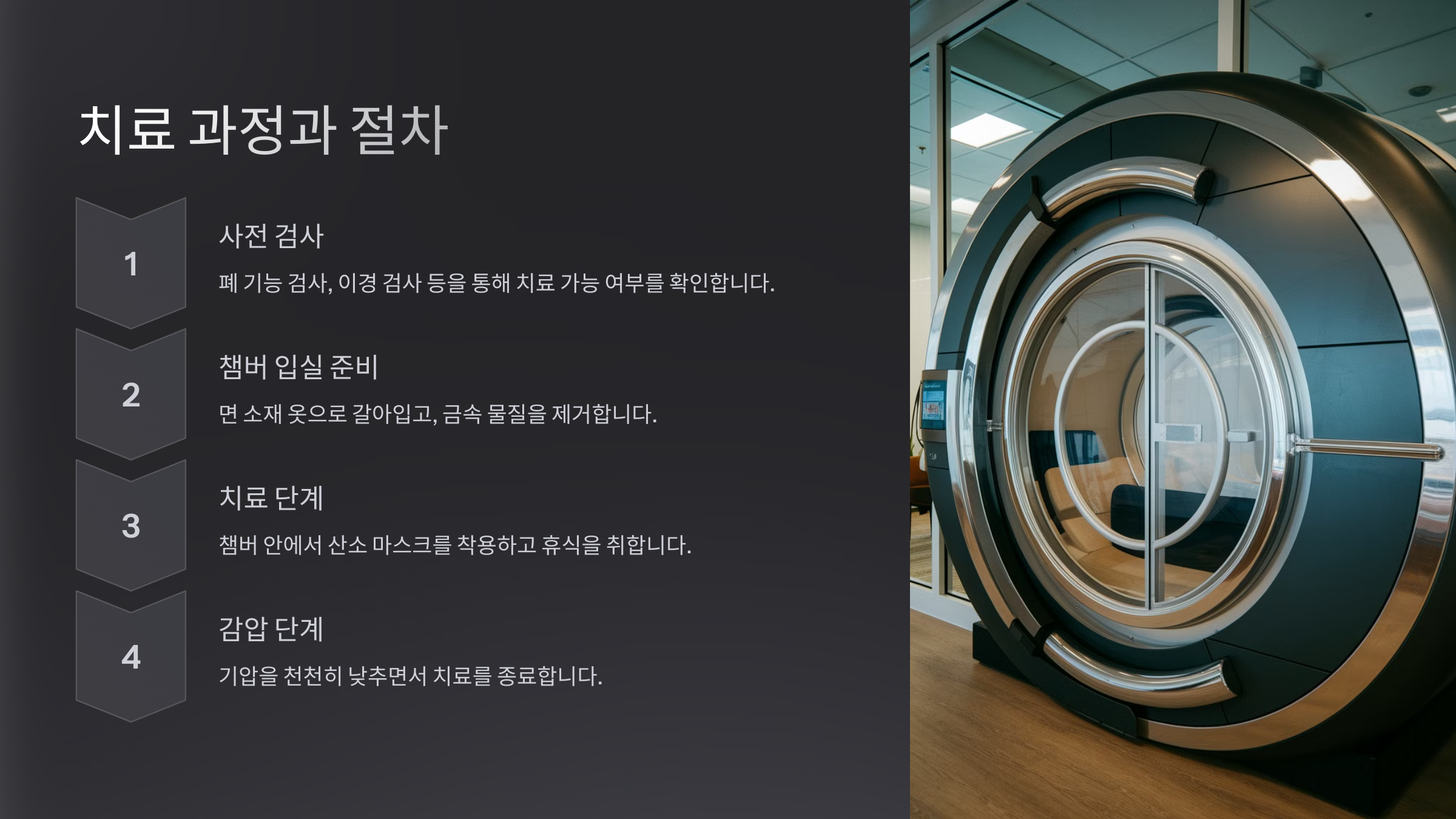 | 3. 치료 진행 | 고압 챔버에서 60~90분 동안 산소 흡입 |