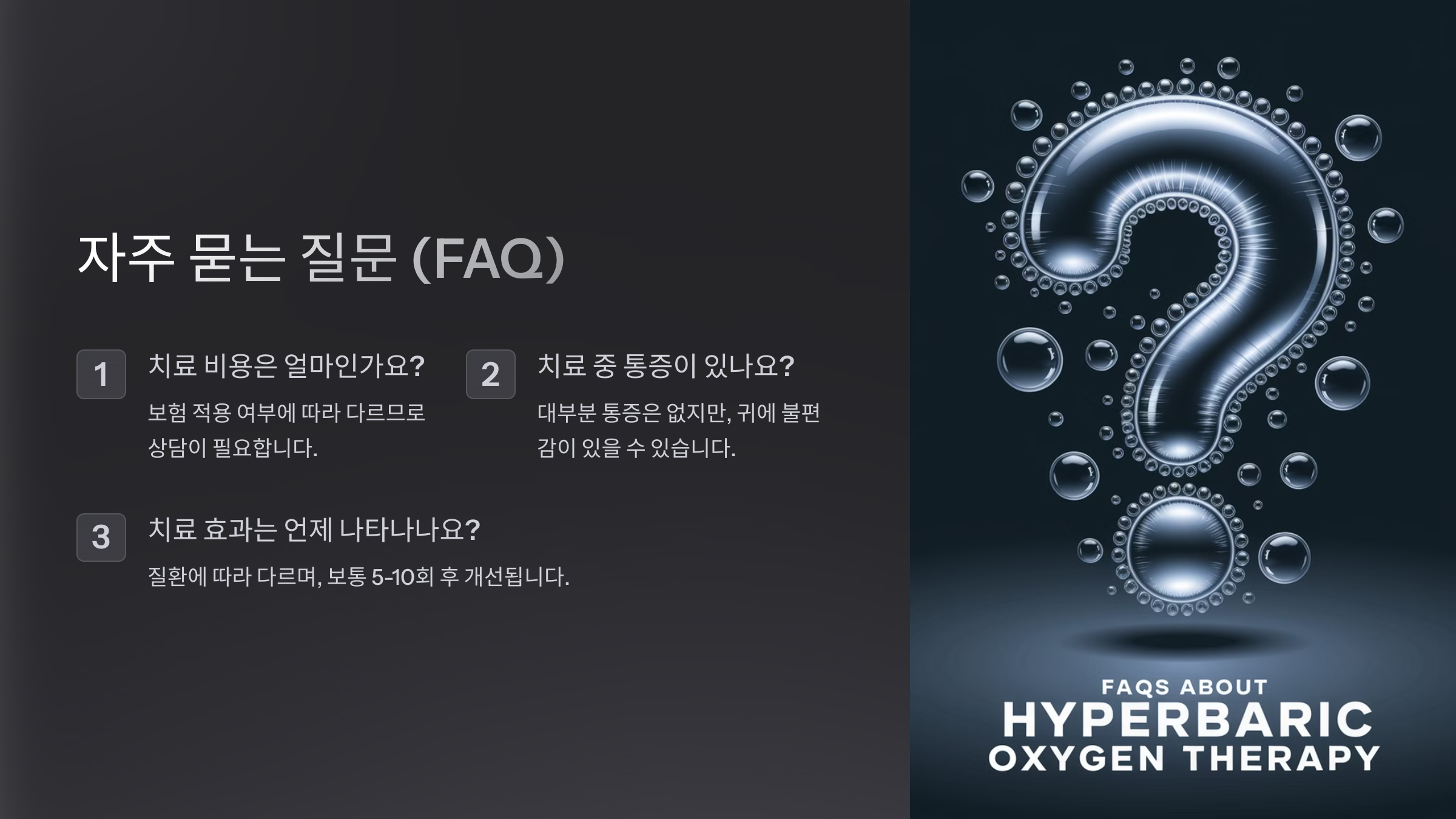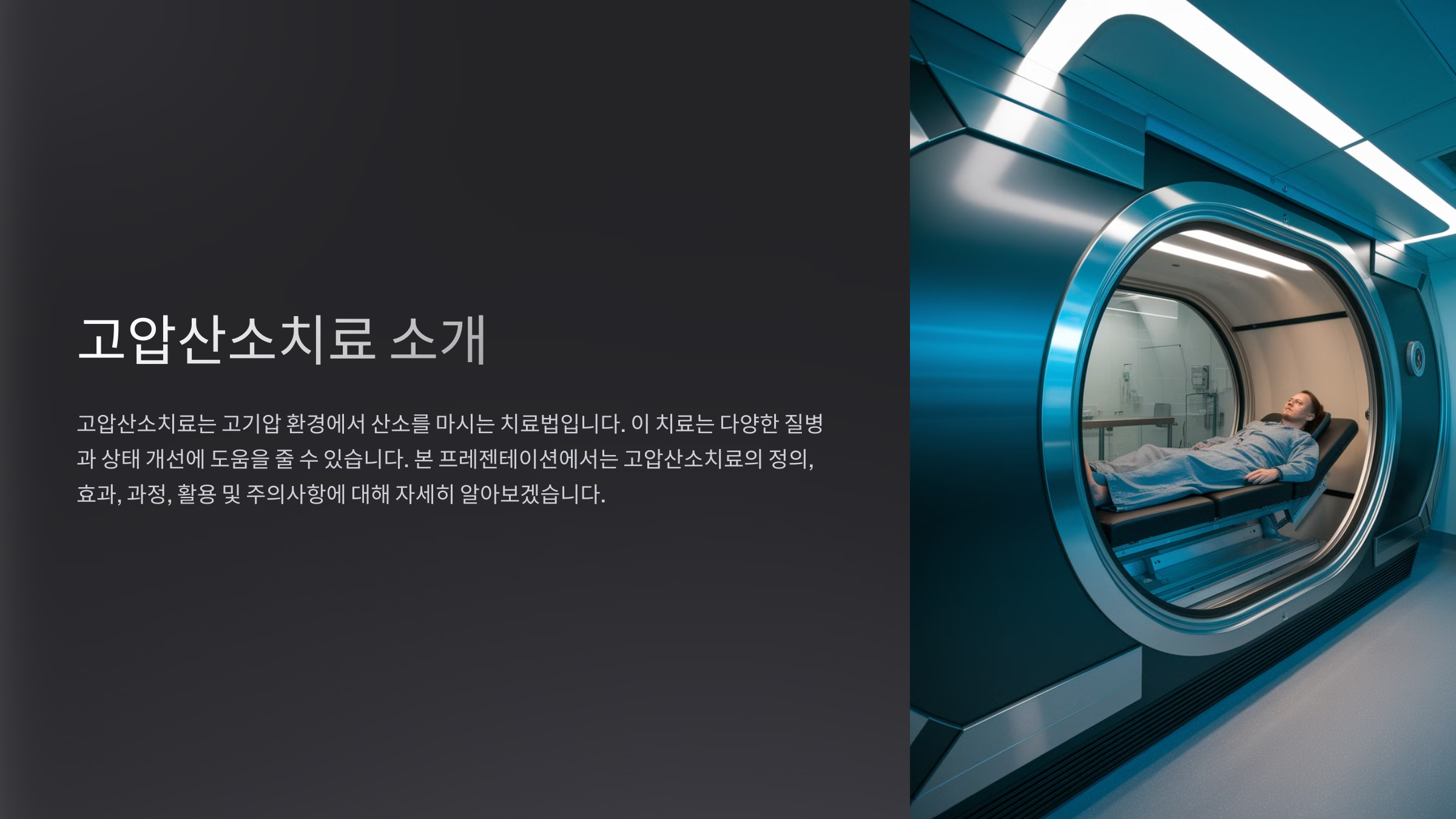 | 3. 치료 진행 | 고압 챔버에서 60~90분 동안 산소 흡입 |
