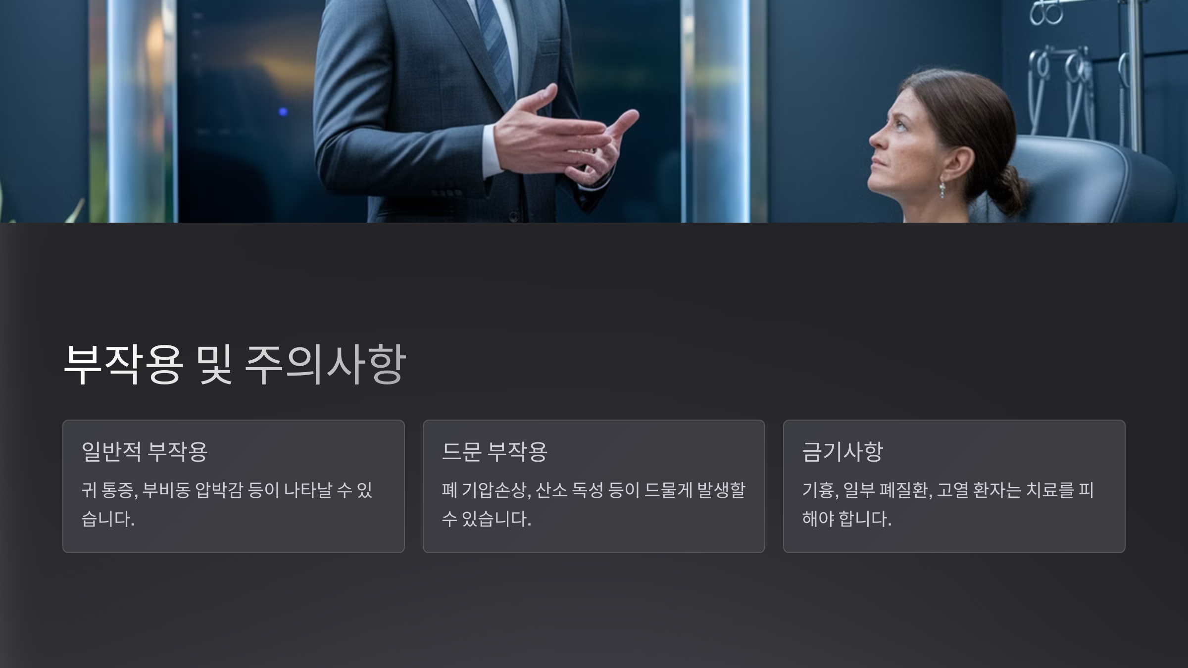 | 산소 중독 | 고농도 산소를 장시간 흡입 시 두통, 어지러움 발생 가능 |