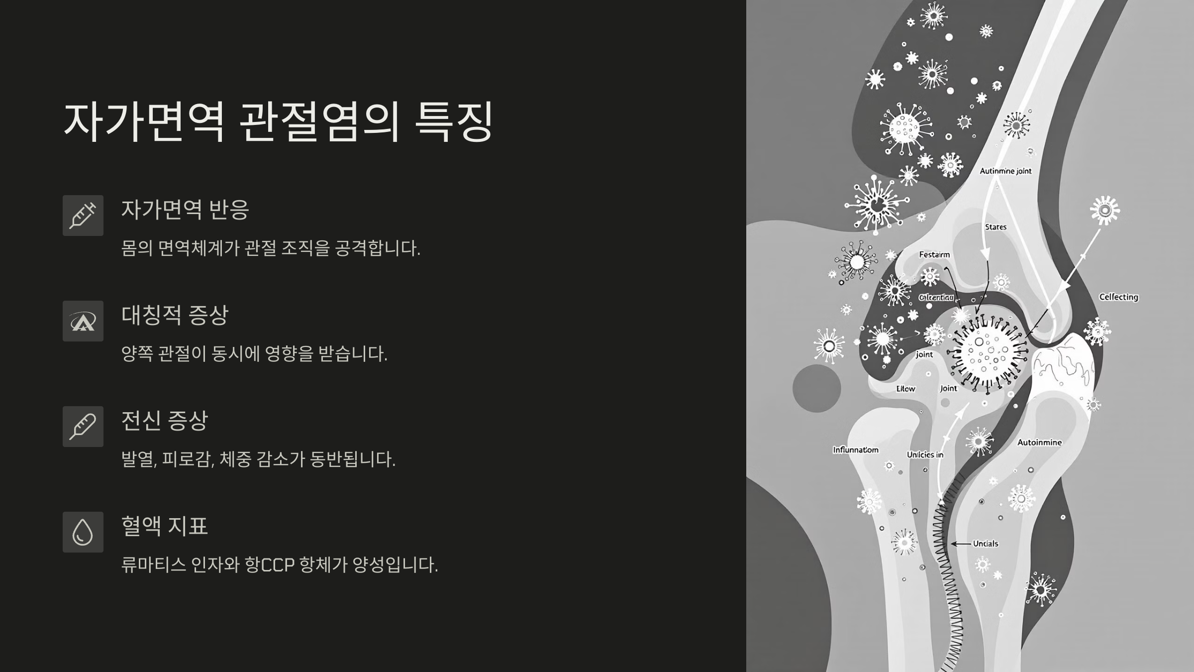 증상은 다양하지만 대부분 만성적인 염증, 관절 붓기, 뻣뻣함, 피로감 등을 동반해요. 특히 류마티스 관절염은 좌우 대칭적으로 나타나는 게 특징이에요. 예를 들어 양손 손가락 관절이 동시에 붓거나 통증이 생기는 식이에요.
