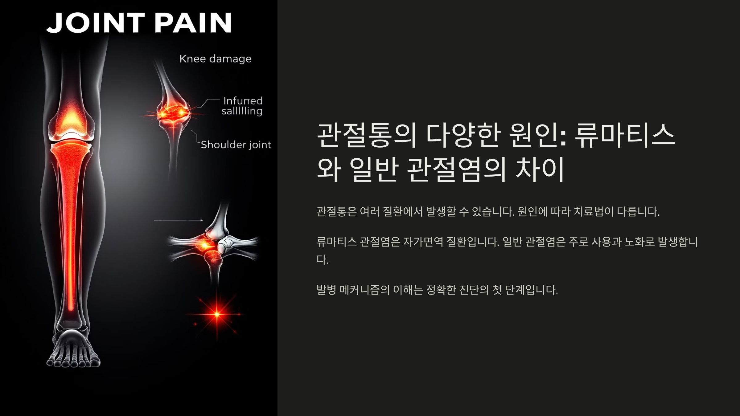 아래부터는 각각의 관절통 유형과 차이점, 구분하는 방법, 그리고 전문가가 실제로 어떤 기준으로 진단하는지 차근차근 설명해볼게요. 😊