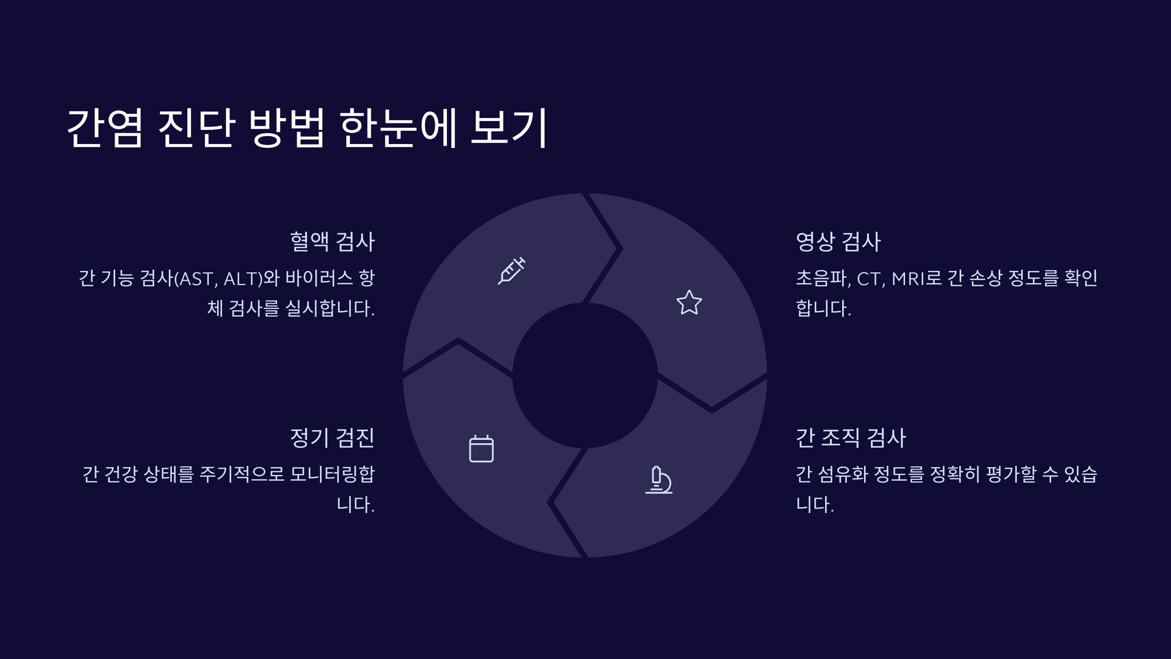 | 초음파/CT | 간 구조 및 이상 확인 | 간암 및 경변 감시 |