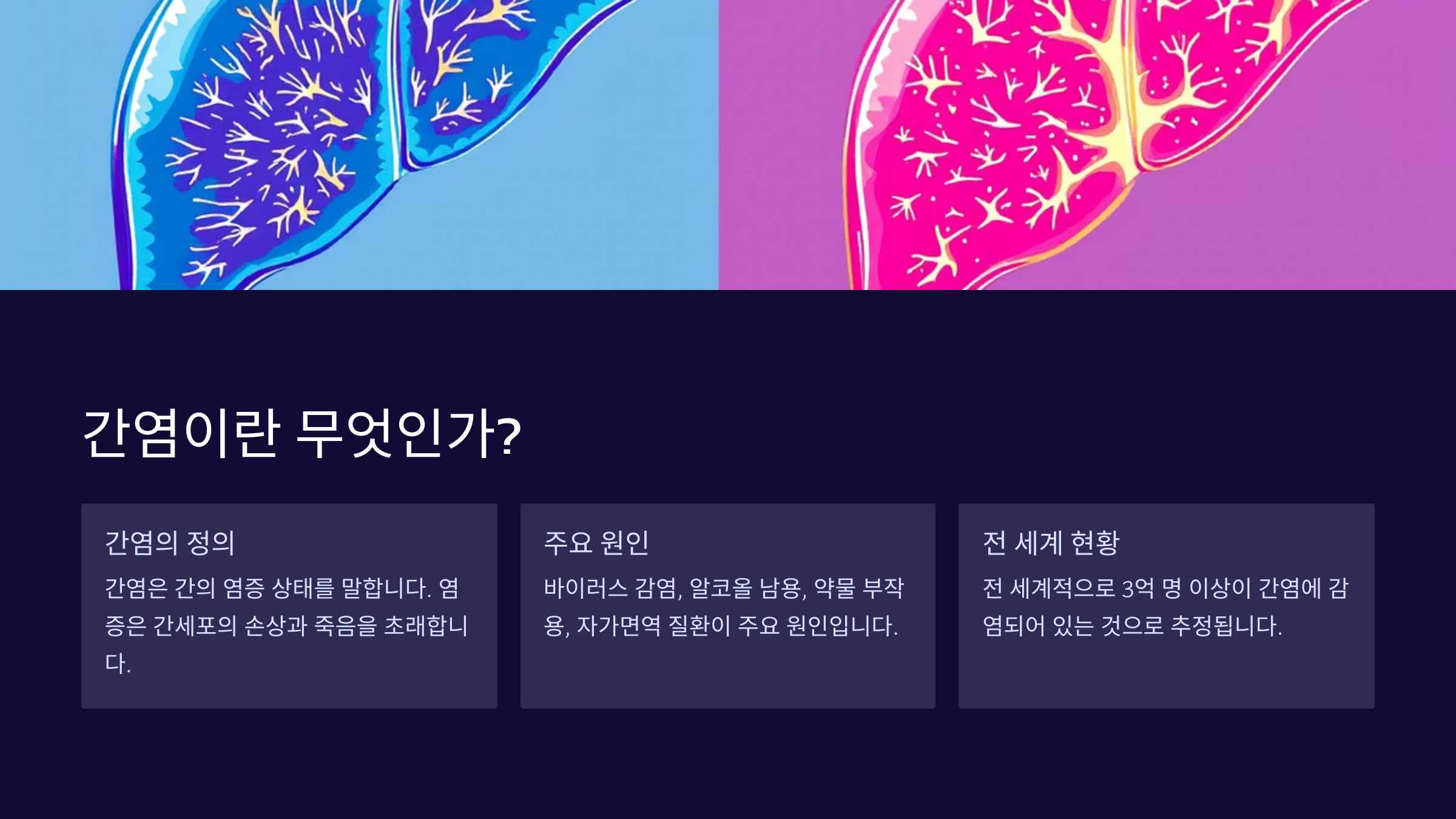 간염은 간에 염증이 생기는 질환으로, 원인은 매우 다양하지만 대부분 바이러스 감염에 의해 발생해요. 간은 우리 몸의 해독기관이라서 간에 문제가 생기면 온몸에 영향을 미치게 되죠. 그만큼 조기 발견과 정확한 이해가 중요한 질환이에요.