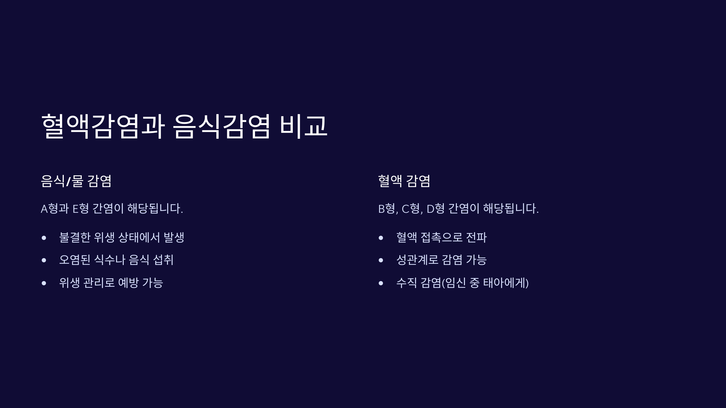 | 음식감염 | A형, E형 | 오염된 음식, 물 | 손씻기, 백신(A형), 식수 주의 |