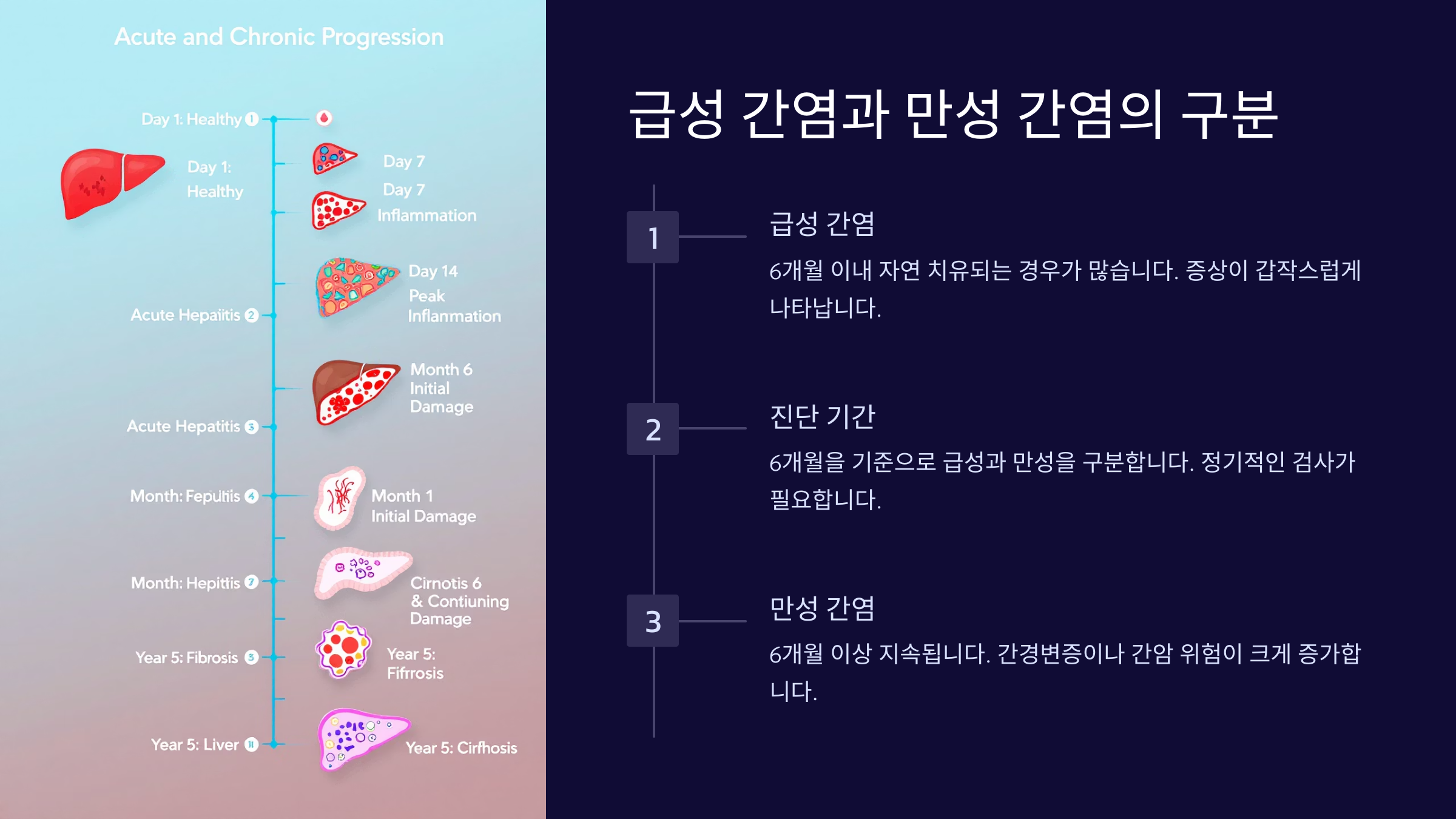 급성 간염은 대개 면역 반응으로 바이러스를 제거하면서 자연 치유가 가능하지만, B형이나 C형은 바이러스가 몸속에 숨어 있다가 만성화되는 경우가 많아 전문적인 치료가 필요해요.