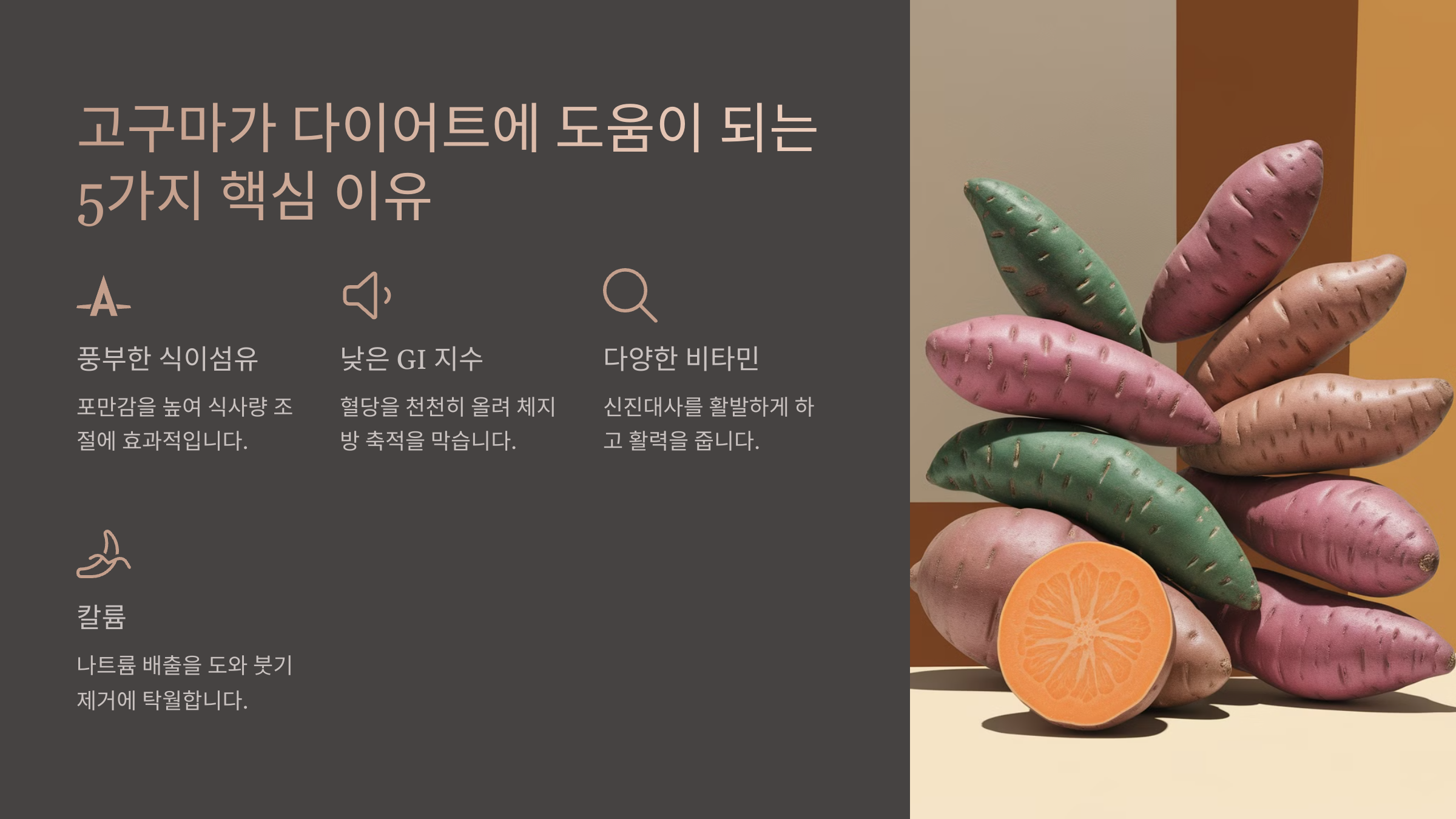 고구마는 단맛이 나지만 **당분이 낮고 포만감이 높아** 다이어트에 좋은 음식으로 꼽혀요. 또한 식이섬유가 풍부해 장 건강을 도와주고, 천천히 소화되면서 혈당을 안정적으로 유지해줘요.