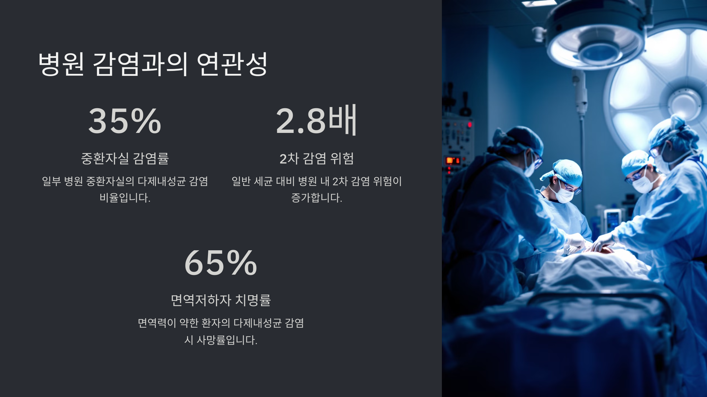 다제내성균의 확산과 병원은 떼려야 뗄 수 없는 관계예요. 실제로 국내외 감염 사례 대부분이 병원 내에서 발생하고 있어요. 입원 중인 환자들이 여러 항생제를 지속적으로 사용하고, 면역력이 약한 상태인 만큼 내성균에 감염되기 쉬운 환경이 조성돼 있기 때문이죠.