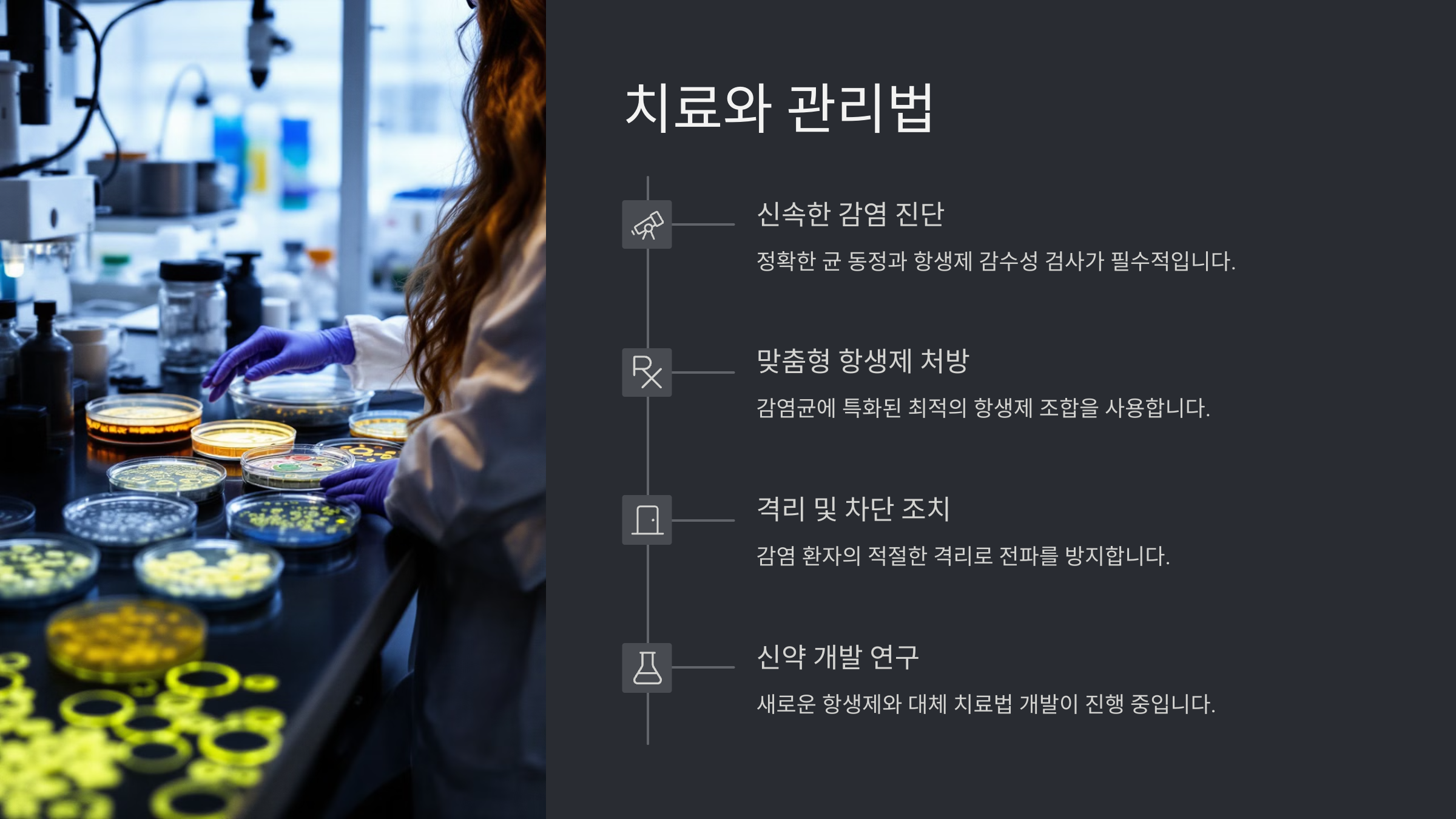 또한, 감염된 부위를 제거하거나 배농(고름 빼기) 같은 외과적 치료가 병행될 수 있어요. 피부 감염이나 농양의 경우엔 수술적 처치 없이 항생제만으로는 낫기 어렵답니다. 이처럼 치료에는 많은 시간이 걸리고, 입원도 길어지기 쉬워요.