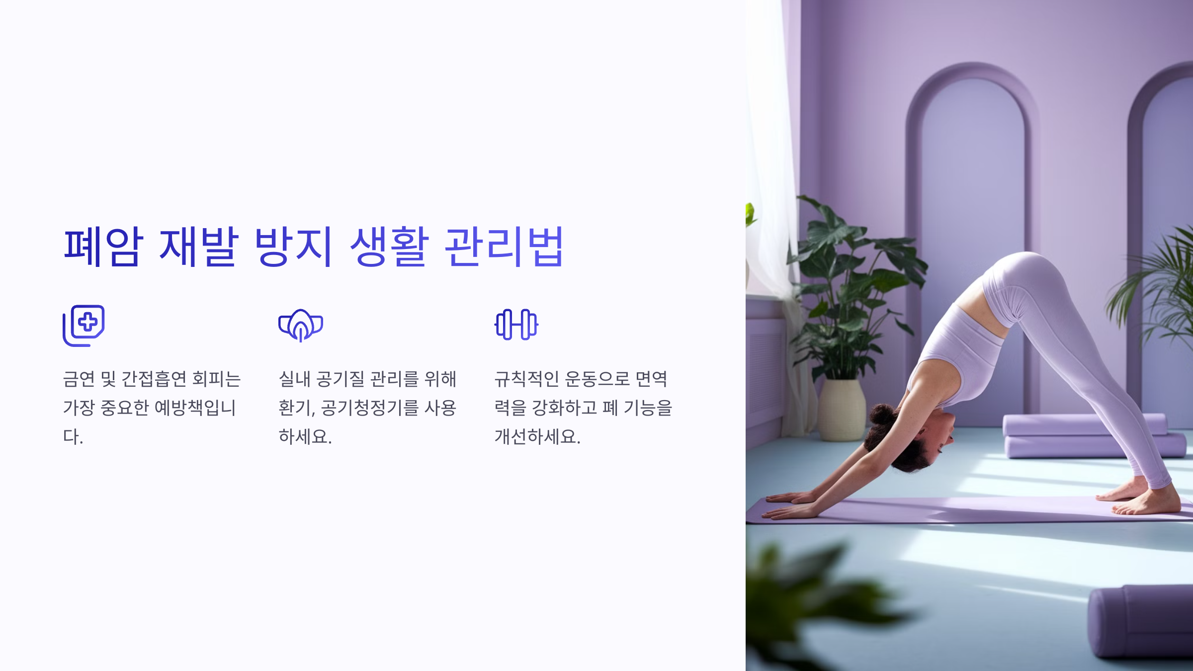 재발을 막기 위해서는 가장 먼저 **금연**이 필수예요. 이미 치료를 받았더라도 흡연을 지속하면 남아 있는 정상 폐 조직이 손상될 가능성이 커져요. 연구에 따르면 금연한 폐암 환자는 계속 흡연한 환자보다 생존율이 더 높다고 해요.