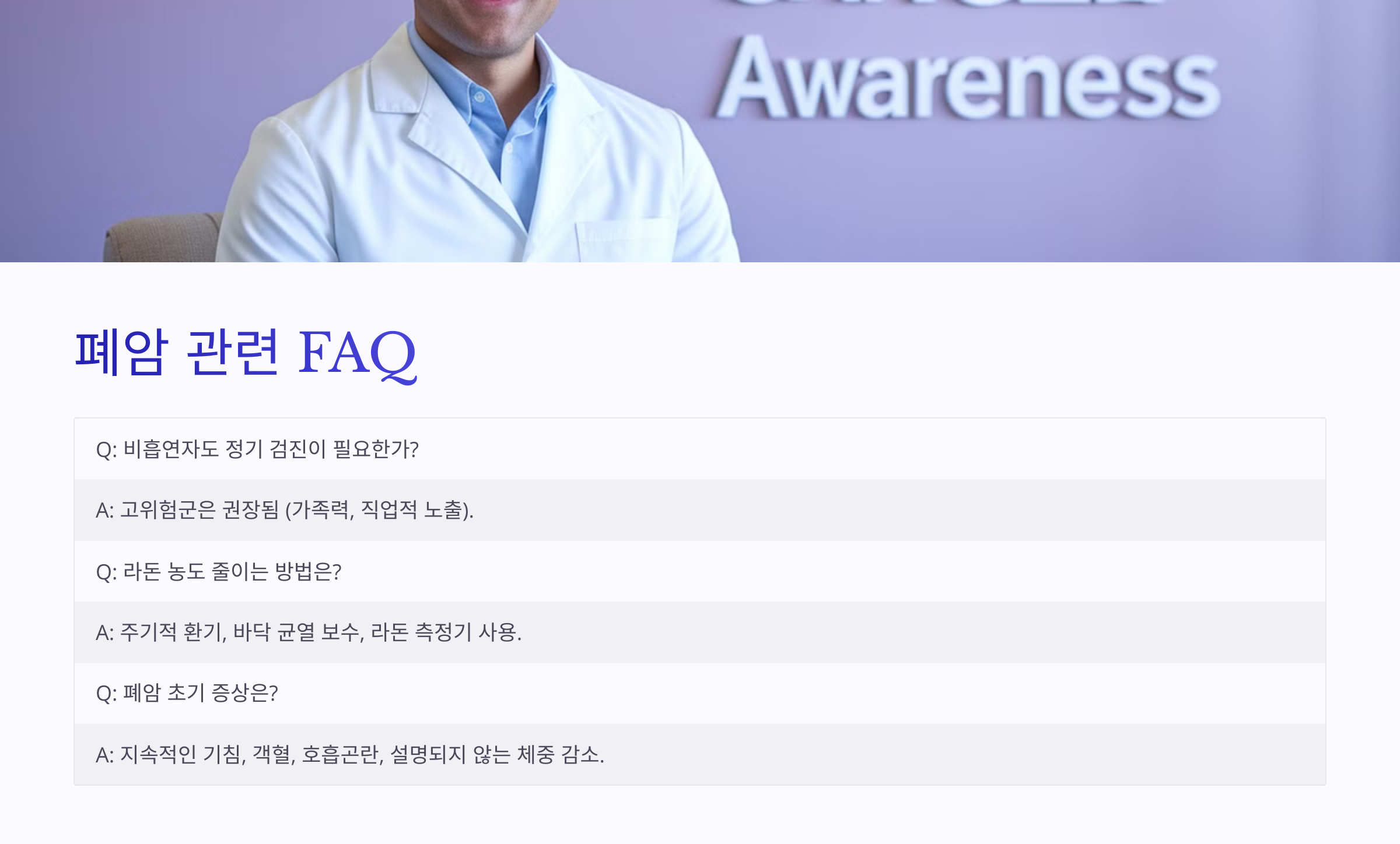 폐암은 초기에 발견할수록 치료가 쉽고 생존율도 높아져요. 따라서 가족력이 있거나 흡연 경험이 있는 사람, 그리고 대기오염이 심한 환경에서 생활하는 사람이라면 정기적인 건강검진을 받는 것이 중요해요!
