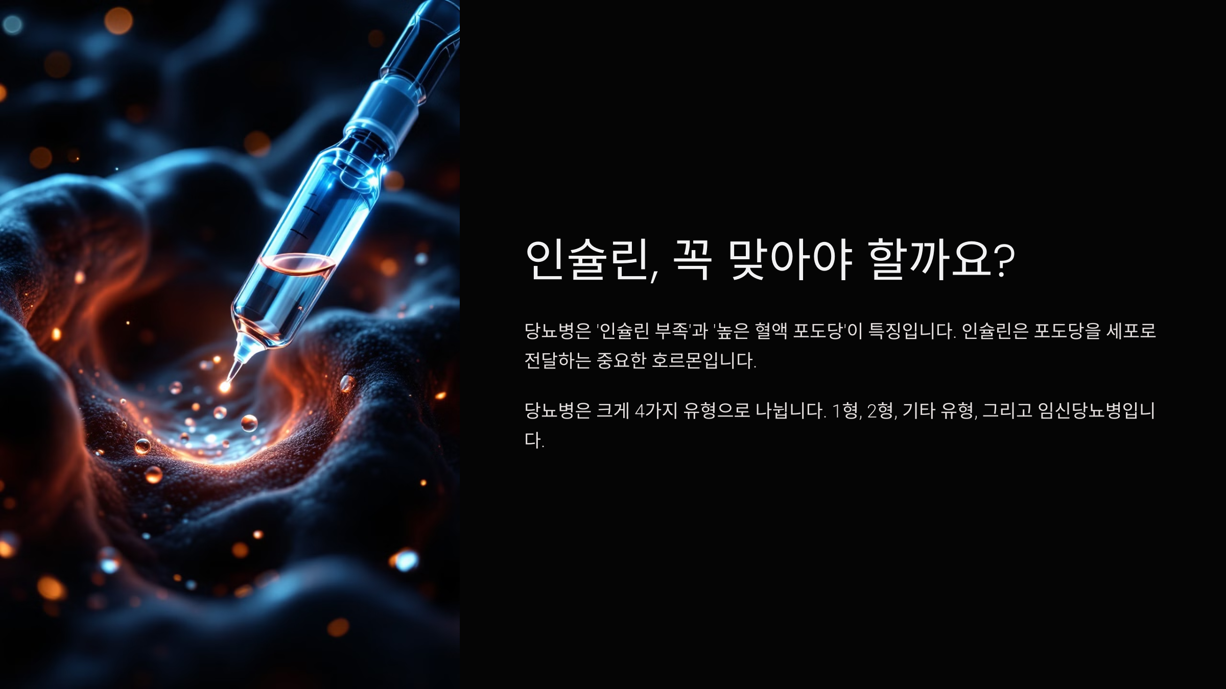 이제 다음으로는 2형 당뇨에서 인슐린이 언제 필요한지 살펴볼 차례예요. 2형 당뇨는 상황에 따라 인슐린이 꼭 필요하지 않을 수도 있거든요. 그럼 이어서 다음 섹션으로 넘어가 볼게요! ⏭️