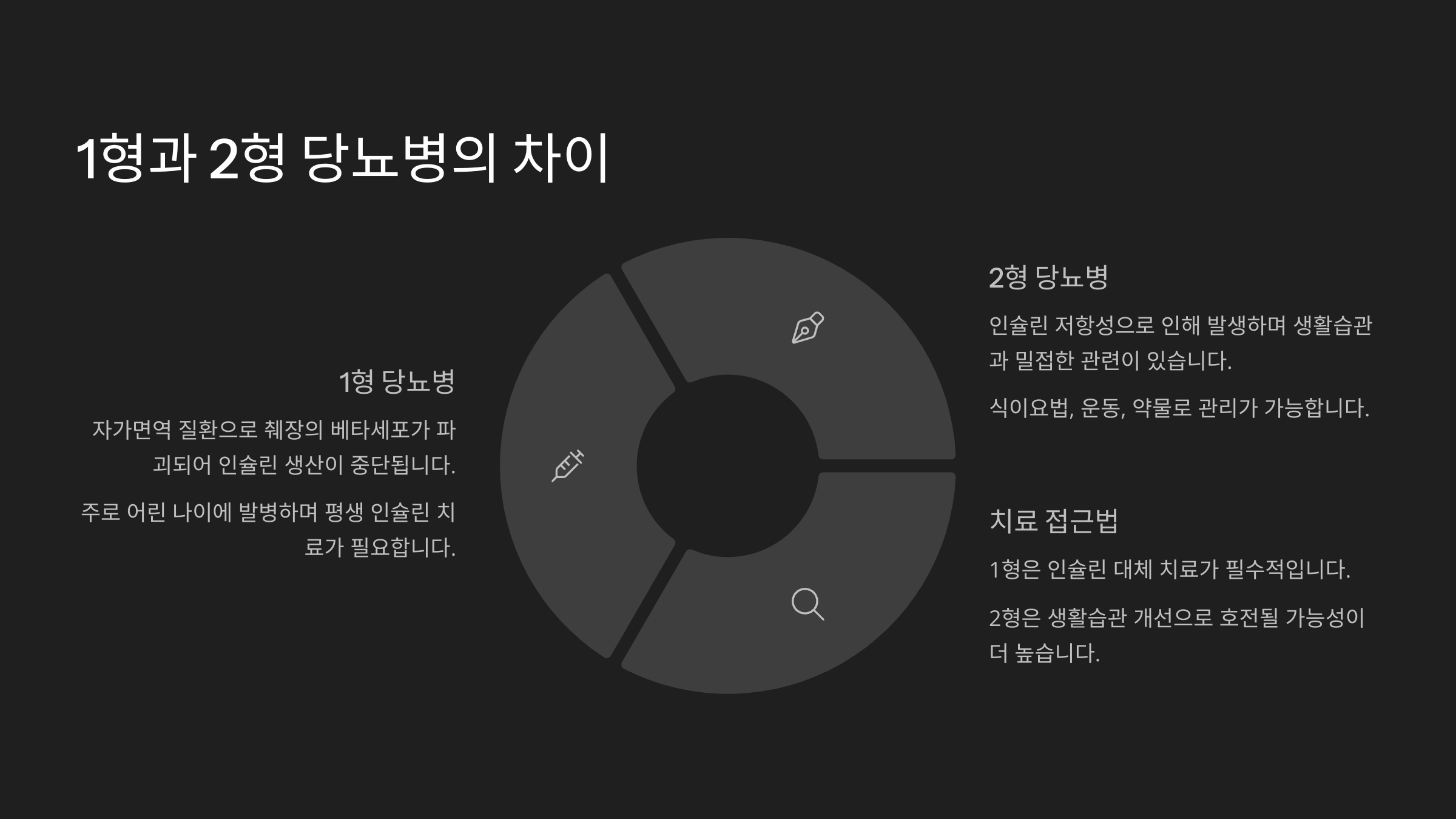 당뇨병은 크게 1형과 2형으로 나뉘어요. 이 두 가지는 발병 원인부터 예후, 치료 방식까지 확연히 달라요. 먼저 1형 당뇨는 자가면역 질환으로, 췌장에서 인슐린을 생산하는 세포가 파괴되어 인슐린을 전혀 만들 수 없는 상태가 되는 거예요.