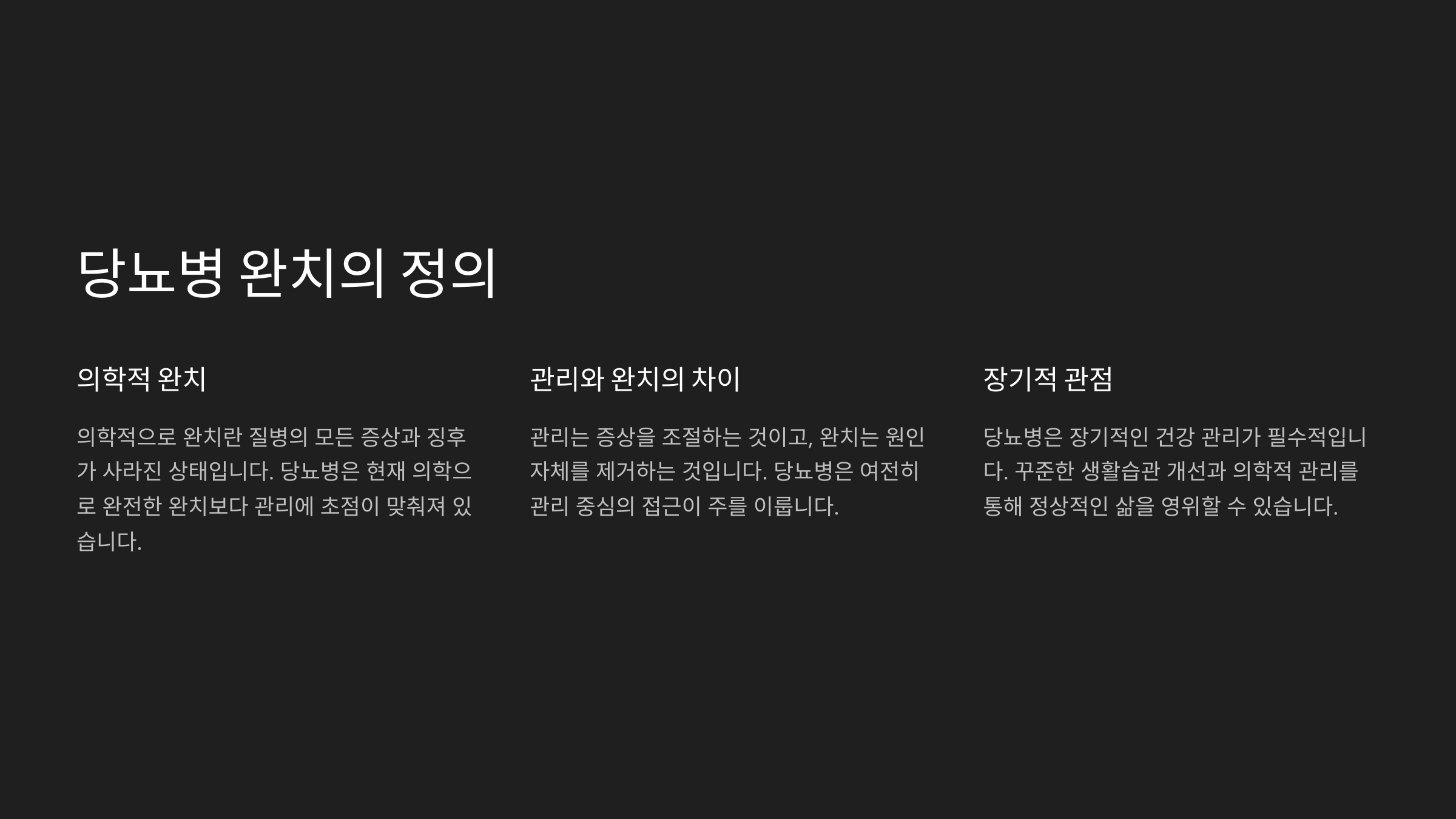 ‘내가 생각했을 때’, 많은 사람들이 당뇨병을 "완치 vs 불치"의 이분법으로만 보기 때문에 오히려 좌절감을 느끼는 것 같아요. 하지만 현대의학에서 말하는 ‘지속적 관해’ 상태는 삶의 질을 높이면서 당뇨의 위험을 사실상 없애는 방법이기도 하답니다. 🔍