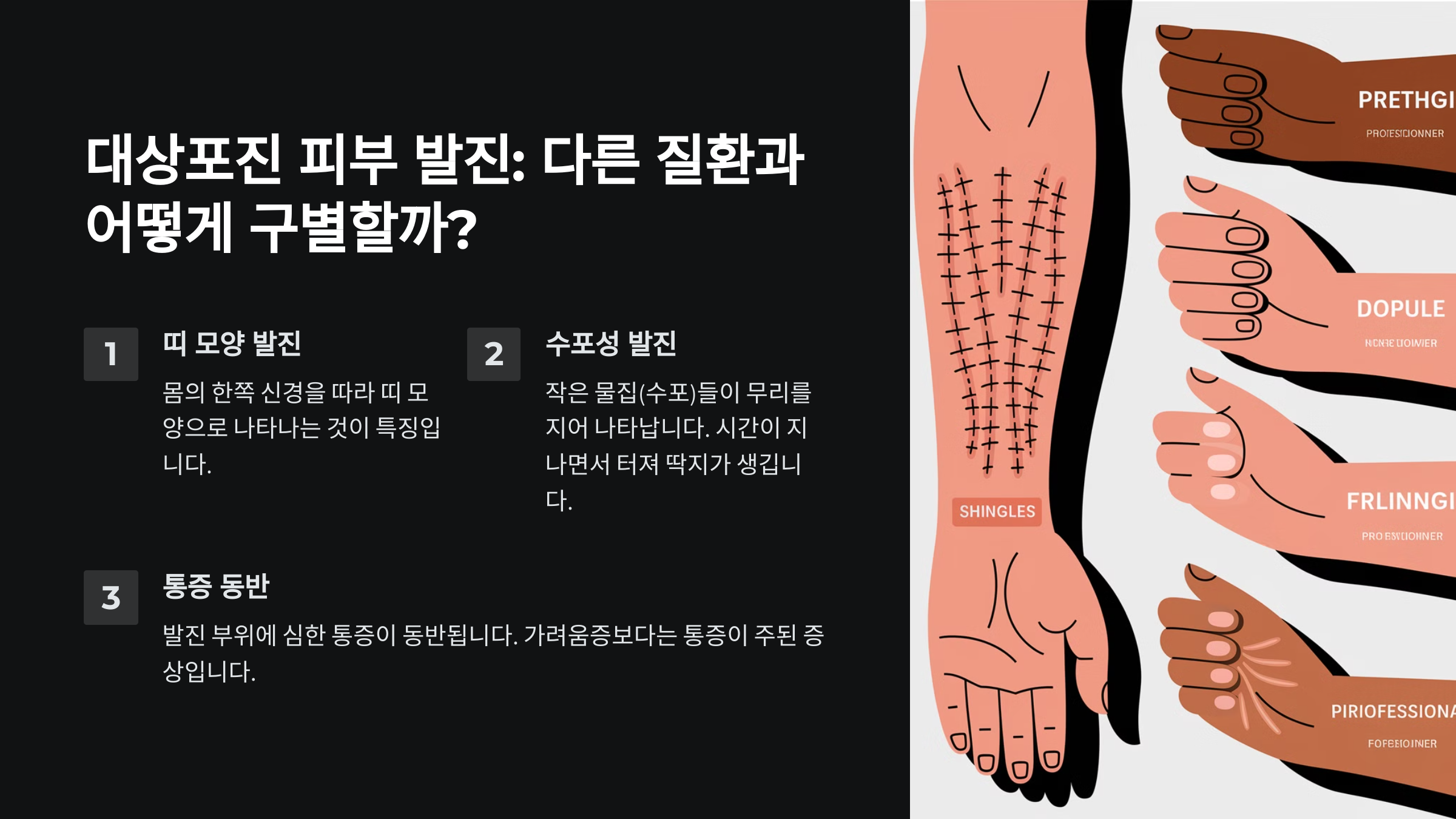 위 비교표를 참고하면, 대상포진이 일반적인 피부질환과 어떻게 다른지 한눈에 알 수 있어요. 만약 신체 한쪽에서만 따끔거림과 발진이 시작된다면, 대상포진일 가능성이 높으니 빨리 병원을 방문하는 것이 좋아요.