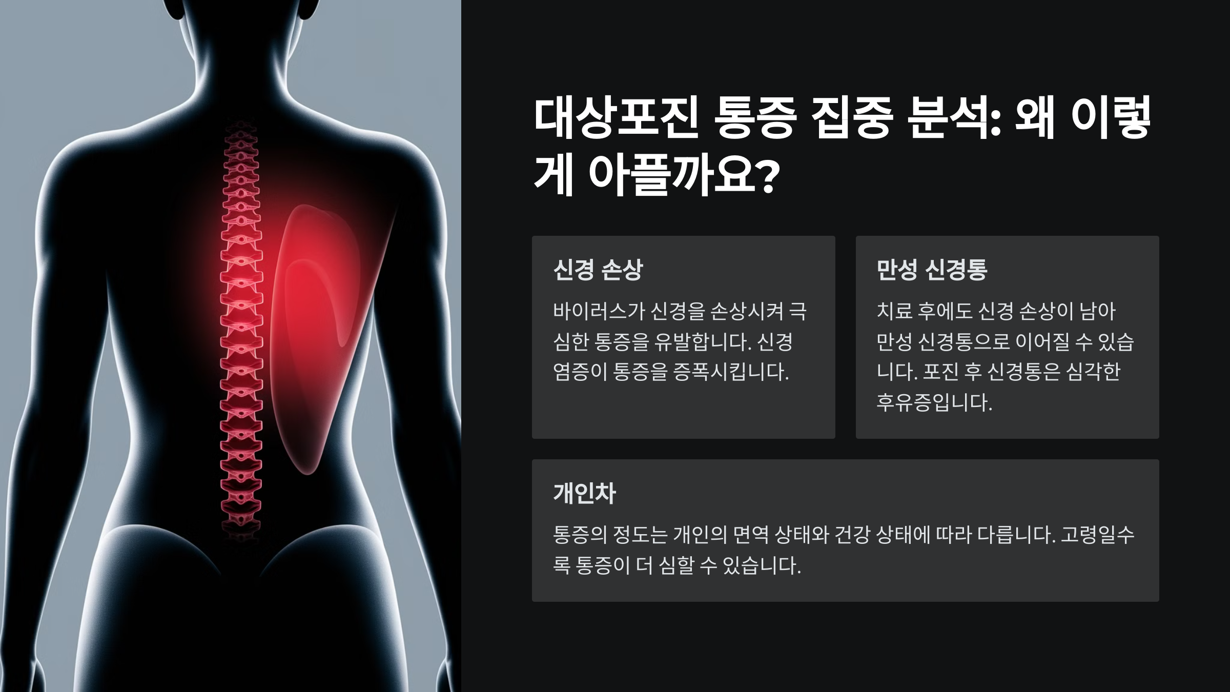 이 통증이 심해지는 이유는 대상포진 바이러스(Varicella-Zoster Virus)가 신경을 직접 공격하기 때문이에요. 바이러스가 활성화되면 신경 염증이 생기고, 작은 자극에도 강한 통증이 유발되는 신경병증성 통증이 발생해요.