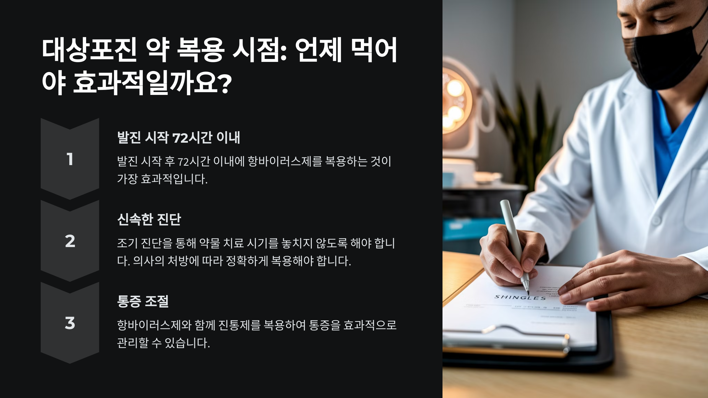 대상포진 치료에서 가장 중요한 것은 **초기 72시간 이내**에 항바이러스제를 복용하는 거예요. 바이러스 억제제는 대상포진 바이러스의 증식을 막아주기 때문에 빠르면 빠를수록 좋아요.