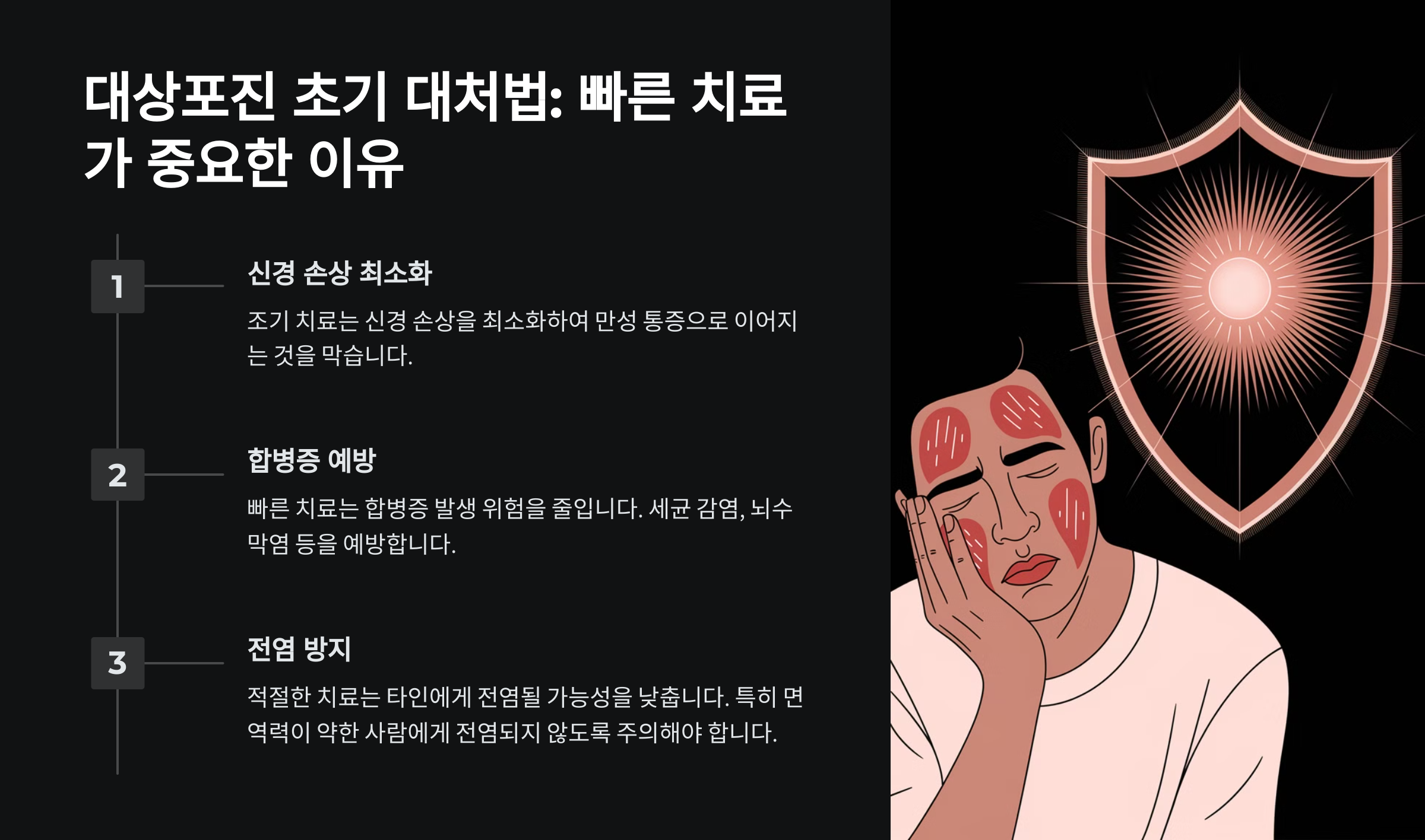 대상포진은 초기에 빠르게 대처하면 합병증을 줄이고 신경통을 예방할 수 있어요. 무조건 참기보다는 증상이 나타나면 신속히 대응하는 것이 중요하답니다.