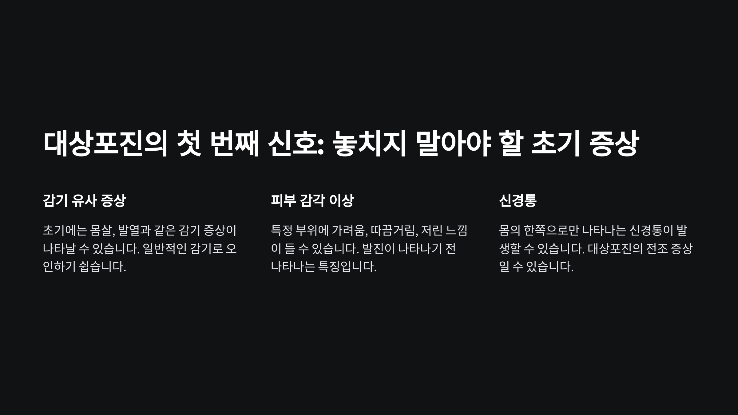 대상포진은 초기에 감기와 비슷한 증상을 보이기 때문에 쉽게 지나칠 수 있어요. 하지만 몇 가지 특징적인 신호가 있기 때문에 주의 깊게 살펴보는 것이 중요해요.