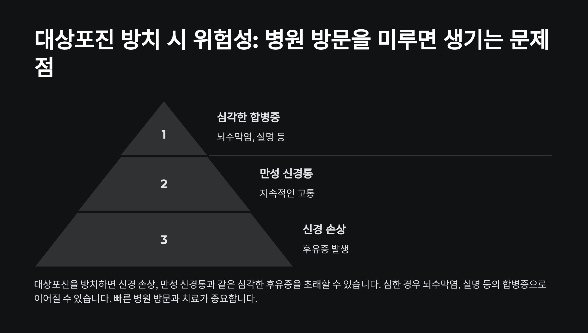 이처럼 대상포진을 방치하면 신경 손상뿐만 아니라 실명, 청력 손실 등 돌이킬 수 없는 결과를 초래할 수 있어요. 따라서 **조기에 치료받는 것이 가장 중요한 예방법**이에요!