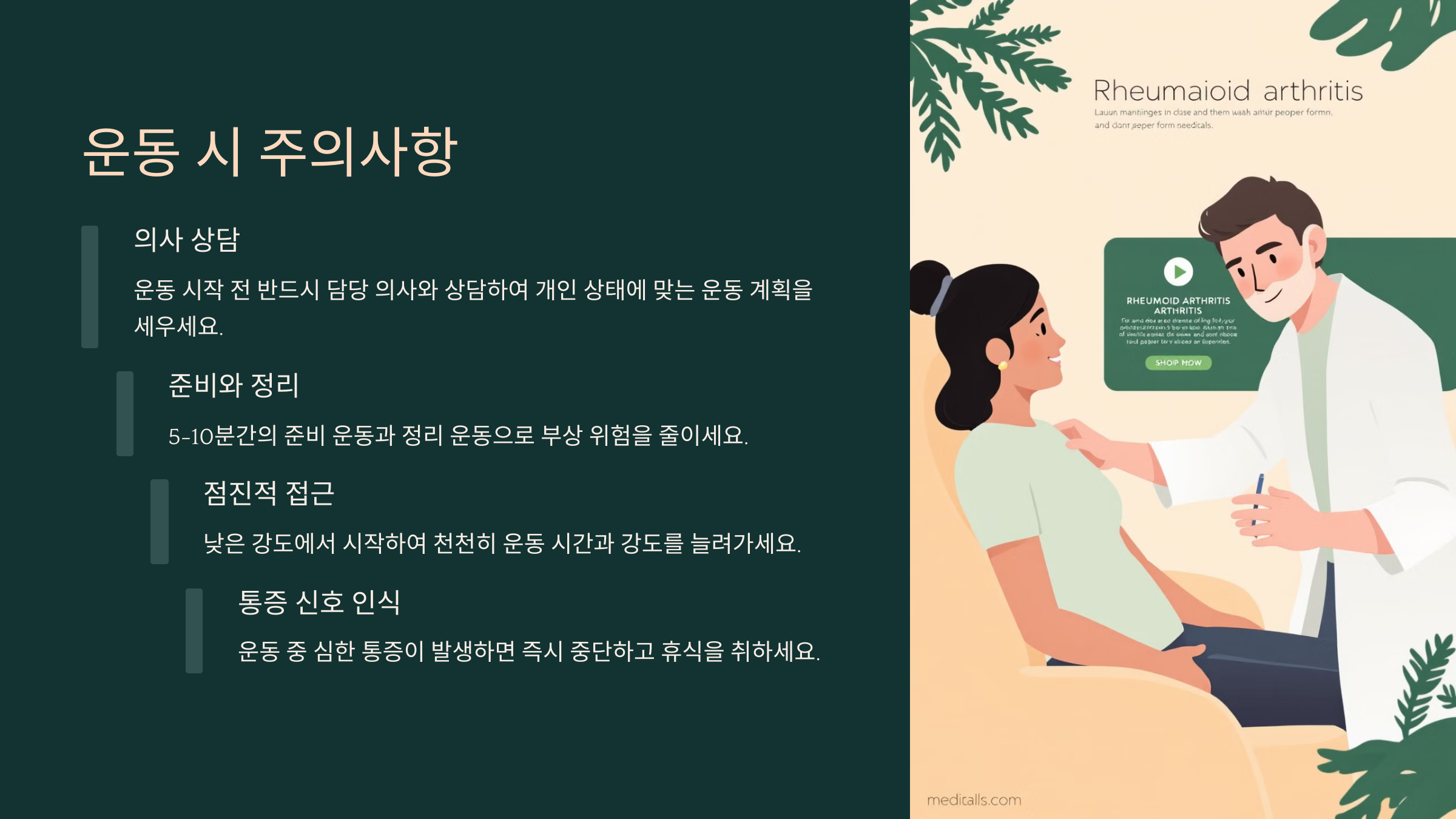 반면 통증이 아주 약하거나, 관절 기능이 회복되는 시기에는 적절한 운동이 회복을 촉진할 수 있어요. 통증이 약한 상태에서도 너무 쉬기만 하면 근육이 약해지고 체력이 떨어져서 관절을 더 힘들게 할 수 있어요. 그럴 때는 스트레칭이나 호흡 운동을 활용해보세요.